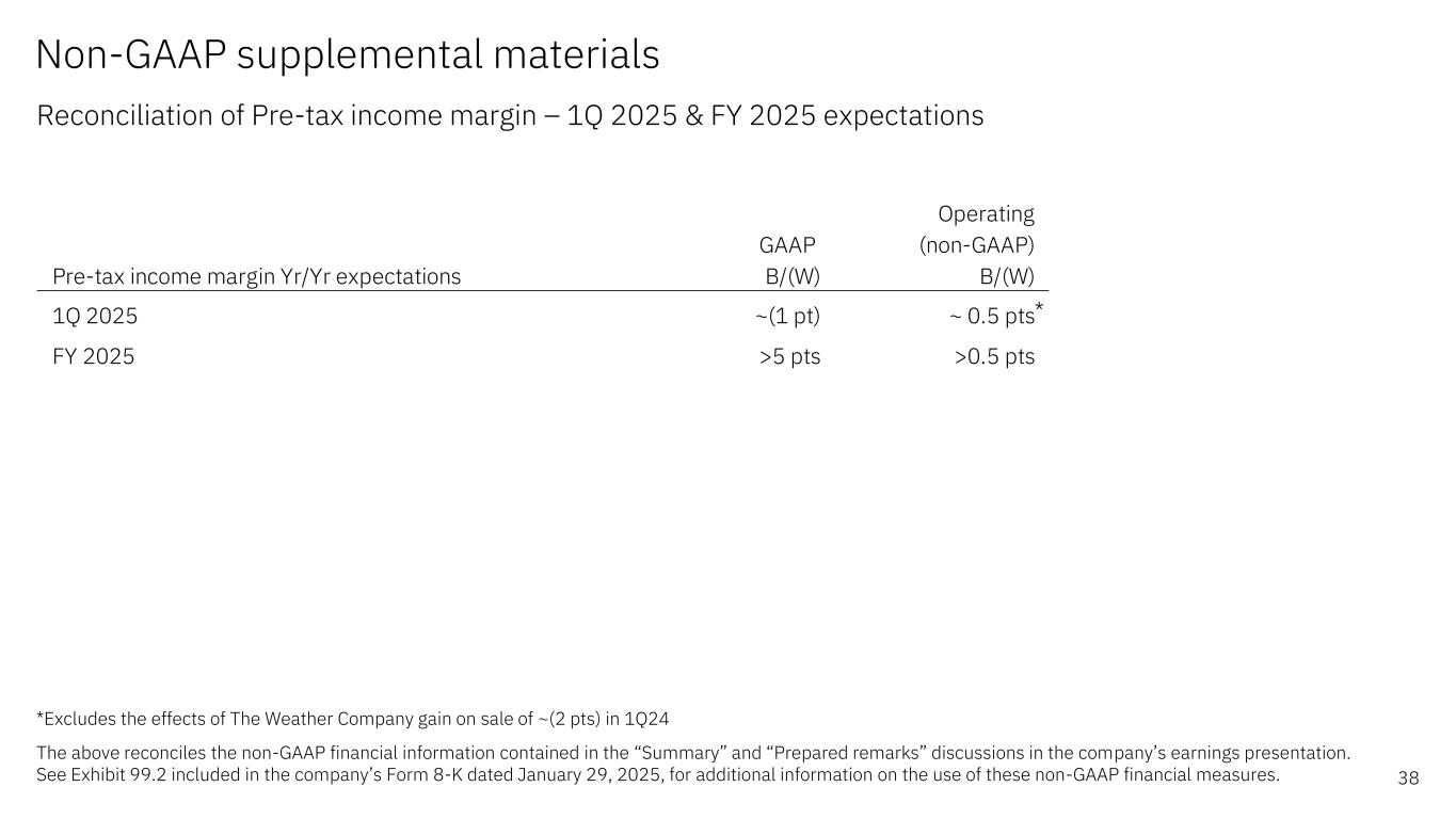 Non-GAAP supplemental materials Reconciliation of net cash from operations to adjusted EBITDA 37 $ in billions *Other assets and liabilities/other, net mainly consists of operating assets and liabilities/other, net in the “Cash flow (ASC230)” discussion, workforce rebalancing charges, non-operating impacts and corporate (gains) and charges The above reconciles the non-GAAP financial information contained in the “Prepared remarks” discussion in the company’s earnings presentation. See Exhibit 99.2 included in the company’s Form 8-K dated January 29, 2025, for additional information on the use of these non-GAAP financial measures. 4Q24 4Q23 FY24 FY23 Net cash provided by operating activities $4.3 $4.5 $13.4 $13.9 Add: Net interest expense $0.3 $0.3 $1.0 $0.9 Provision for/(Benefit from) income taxes from continuing operations $0.4 $0.5 ($0.2) $1.2 Less change in: Financing receivables ($2.3) ($1.9) ($0.4) $1.2 Other assets and liabilities/other, net* $1.7 $1.6 ($1.8) ($0.7) Adjusted EBITDA $5.6 $5.5 $16.4 $15.5