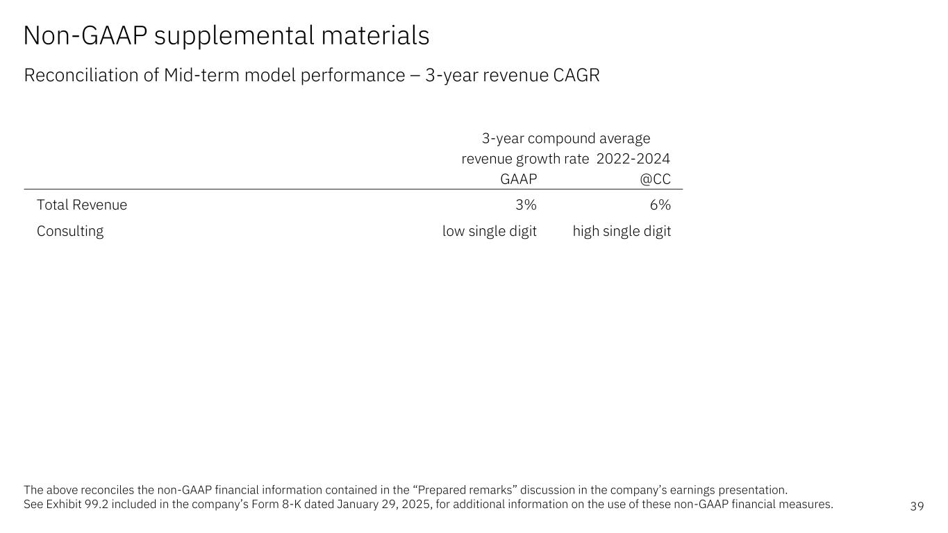 Non-GAAP supplemental materials Reconciliation of Mid-term model performance – 3-year revenue CAGR The above reconciles the non-GAAP financial information contained in the “Prepared remarks” discussion in the company’s earnings presentation. See Exhibit 99.2 included in the company’s Form 8-K dated January 29, 2025, for additional information on the use of these non-GAAP financial measures. 39 GAAP @CC Total Revenue 3% 6% Consulting low single digit high single digit 3-year compound average revenue growth rate 2022-2024