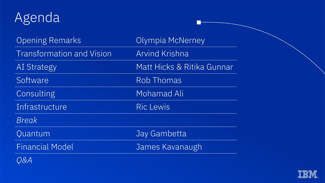 Agenda Opening Remarks Olympia McNerney Transformation and Vision Arvind Krishna AI Strategy Matt Hicks & Ritika Gunnar Software Rob Thomas Consulting Mohamad Ali Infrastructure Ric Lewis Break Quantum Jay Gambetta Financial Model James Kavanaugh Q&A