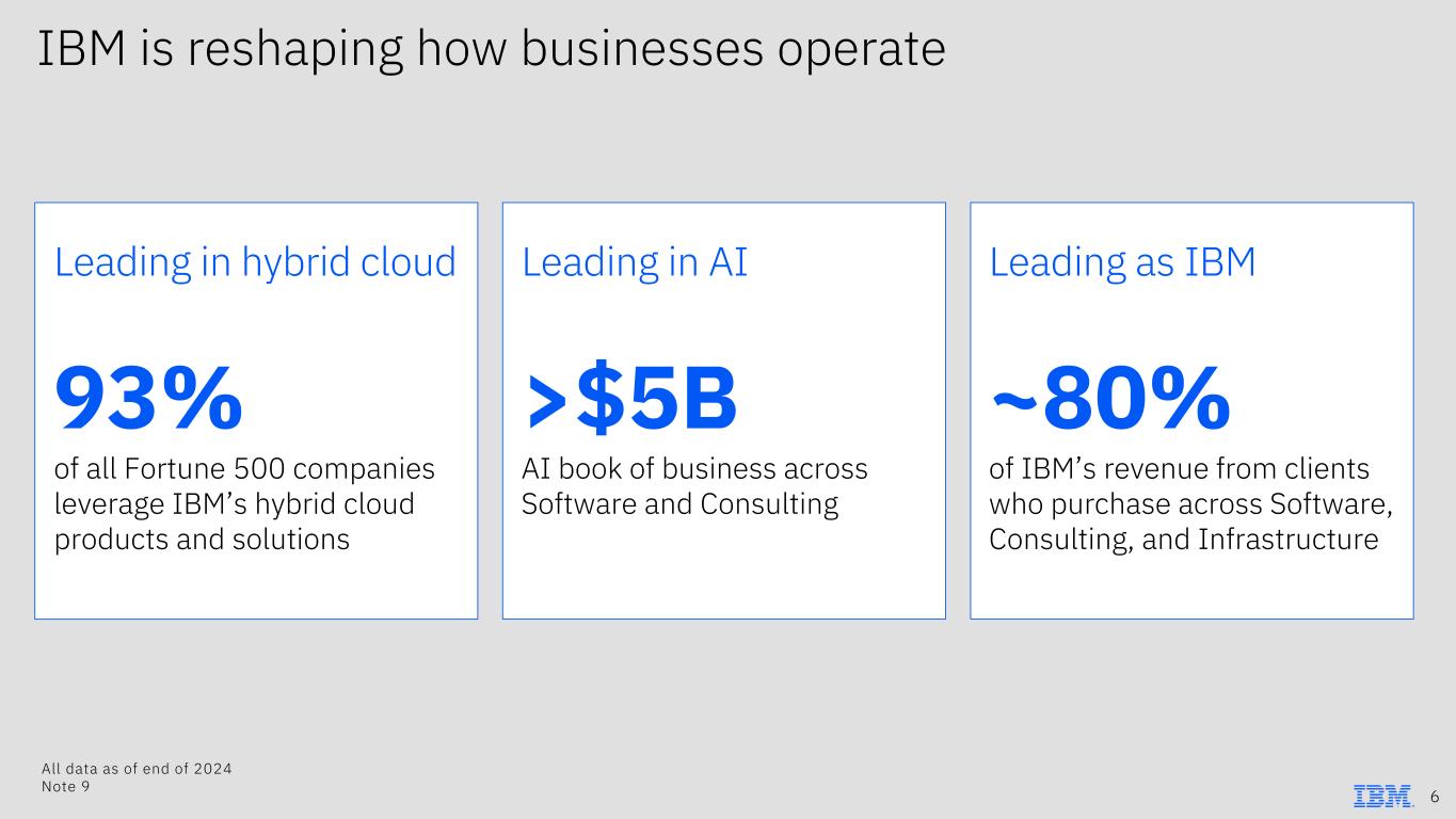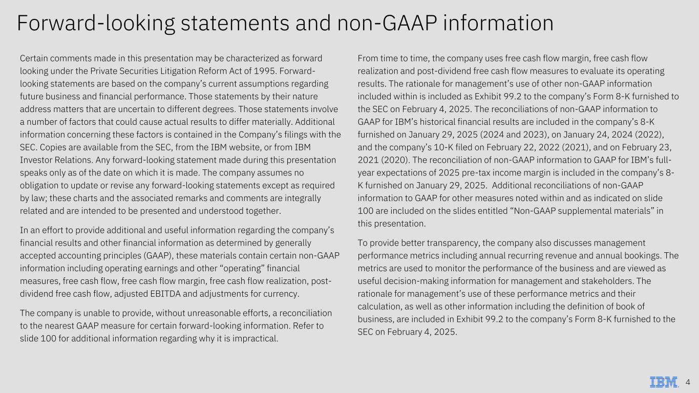 Forward-looking statements and non-GAAP information Certain comments made in this presentation may be characterized as forward looking under the Private Securities Litigation Reform Act of 1995. Forward- looking statements are based on the company’s current assumptions regarding future business and financial performance. Those statements by their nature address matters that are uncertain to different degrees. Those statements involve a number of factors that could cause actual results to differ materially. Additional information concerning these factors is contained in the Company’s filings with the SEC. Copies are available from the SEC, from the IBM website, or from IBM Investor Relations. Any forward-looking statement made during this presentation speaks only as of the date on which it is made. The company assumes no obligation to update or revise any forward-looking statements except as required by law; these charts and the associated remarks and comments are integrally related and are intended to be presented and understood together. In an effort to provide additional and useful information regarding the company’s financial results and other financial information as determined by generally accepted accounting principles (GAAP), these materials contain certain non-GAAP information including operating earnings and other “operating” financial measures, free cash flow, free cash flow margin, free cash flow realization, post- dividend free cash flow, adjusted EBITDA and adjustments for currency. The company is unable to provide, without unreasonable efforts, a reconciliation to the nearest GAAP measure for certain forward-looking information. Refer to slide 100 for additional information regarding why it is impractical. From time to time, the company uses free cash flow margin, free cash flow realization and post-dividend free cash flow measures to evaluate its operating results. The rationale for management’s use of other non-GAAP information included within is included as Exhibit 99.2 to the company’s Form 8-K furnished to the SEC on February 4, 2025. The reconciliations of non-GAAP information to GAAP for IBM’s historical financial results are included in the company’s 8-K furnished on January 29, 2025 (2024 and 2023), on January 24, 2024 (2022), and the company’s 10-K filed on February 22, 2022 (2021), and on February 23, 2021 (2020). The reconciliation of non-GAAP information to GAAP for IBM’s full- year expectations of 2025 pre-tax income margin is included in the company’s 8- K furnished on January 29, 2025. Additional reconciliations of non-GAAP information to GAAP for other measures noted within and as indicated on slide 100 are included on the slides entitled “Non-GAAP supplemental materials” in this presentation. To provide better transparency, the company also discusses management performance metrics including annual recurring revenue and annual bookings. The metrics are used to monitor the performance of the business and are viewed as useful decision-making information for management and stakeholders. The rationale for management’s use of these performance metrics and their calculation, as well as other information including the definition of book of business, are included in Exhibit 99.2 to the company’s Form 8-K furnished to the SEC on February 4, 2025. 4