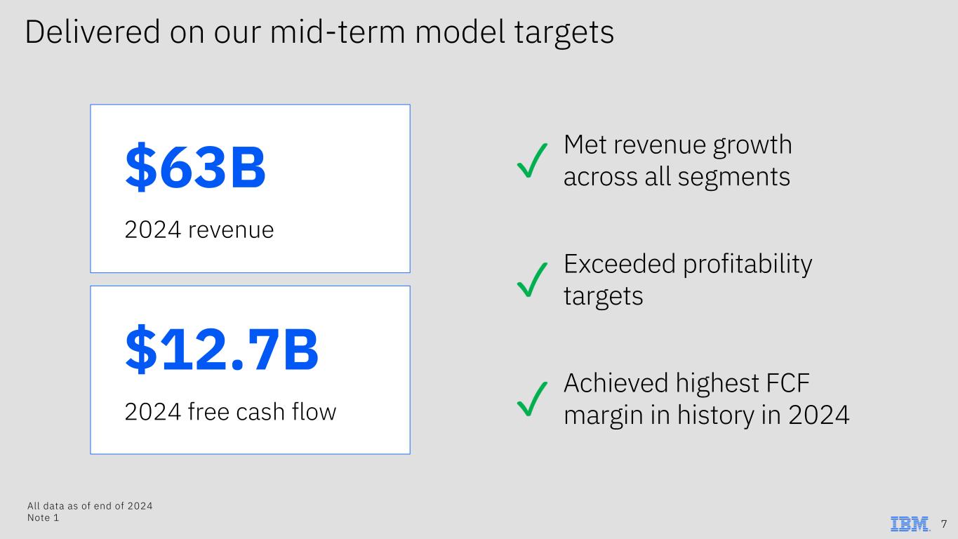 IBM is reshaping how businesses operate 93% of all Fortune 500 companies leverage IBM’s hybrid cloud products and solutions >$5B AI book of business across Software and Consulting ~80% of IBM’s revenue from clients who purchase across Software, Consulting, and Infrastructure Leading in hybrid cloud Leading in AI Leading as IBM All data as of end of 2024 Note 9 6