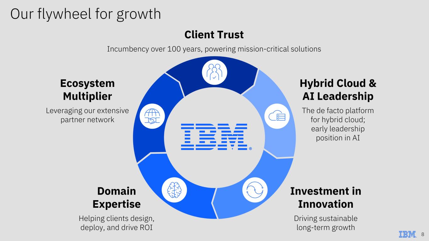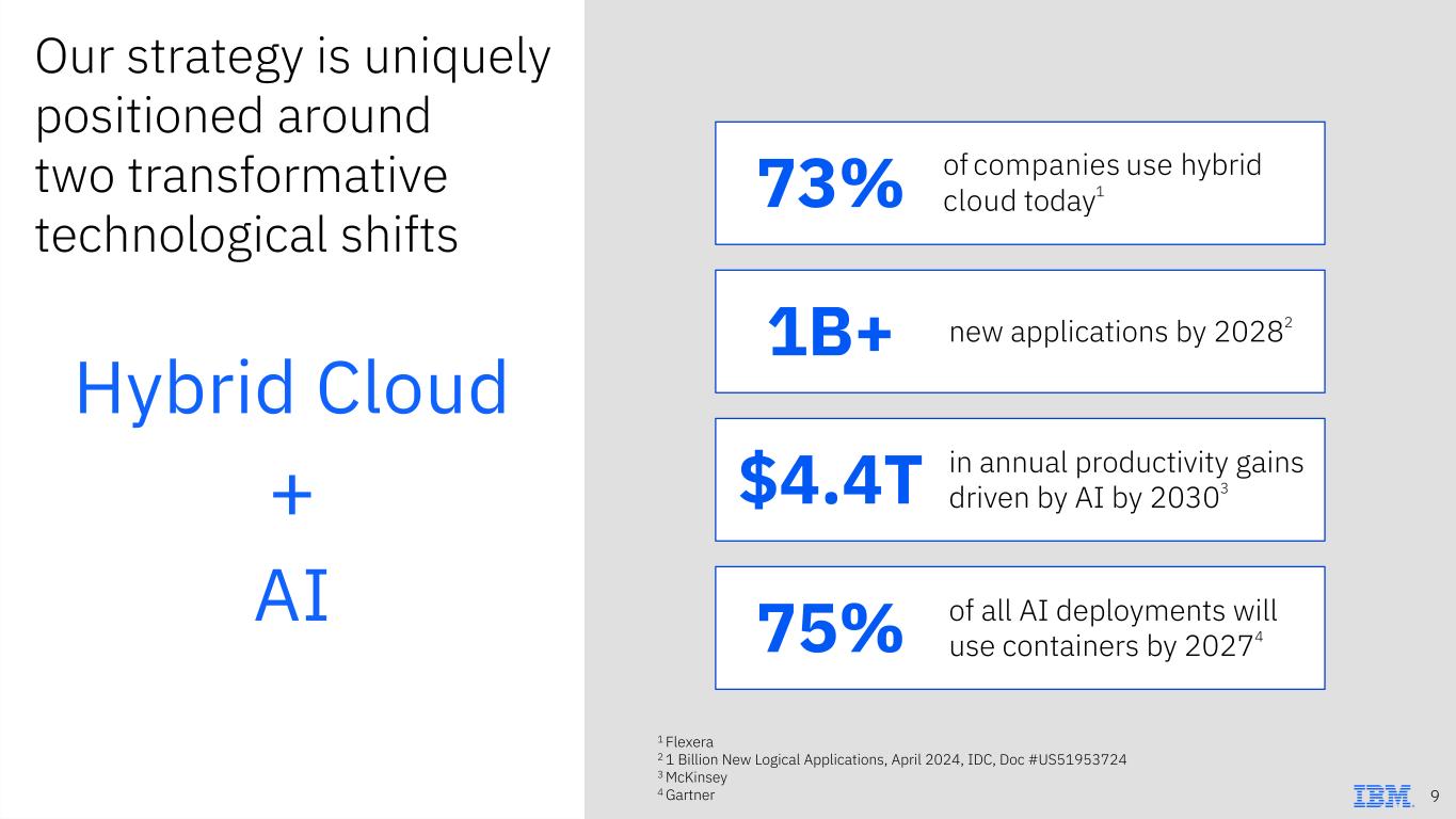 Our flywheel for growth Client Trust Incumbency over 100 years, powering mission-critical solutions Hybrid Cloud & AI Leadership The de facto platform for hybrid cloud; early leadership position in AI Domain Expertise Helping clients design, deploy, and drive ROI Ecosystem Multiplier Leveraging our extensive partner network Investment in Innovation Driving sustainable long-term growth 8