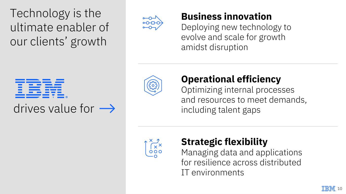 Our strategy is uniquely positioned around two transformative technological shifts new applications by 202821B+ 73% of companies use hybrid cloud today1 in annual productivity gains driven by AI by 20303$4.4T of all AI deployments will use containers by 2027475% Hybrid Cloud + AI 9 1 Flexera 2 1 Billion New Logical Applications, April 2024, IDC, Doc #US51953724 3 McKinsey 4 Gartner