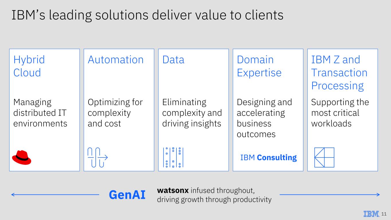 Repositioned portfolio to align with IBM’s growth vectors of hybrid cloud and AI; >$4B GenAI book of business Leading the way with human + digital labor – a first of kind AI delivery platform leveraging IBM Technology Significant opportunity to grow penetration with strategic partners and use M&A to augment skills Tip of the spear driving scale and adoption of our platforms, pulling through Red Hat and IBM Technology Differentiated offerings, deep expertise, and integrated go-to-market driving market share expansion Consulting’s role in IBM’s flywheel for growth 59 Note 9