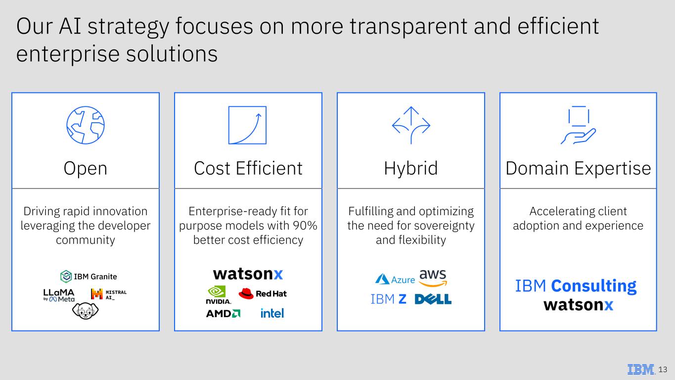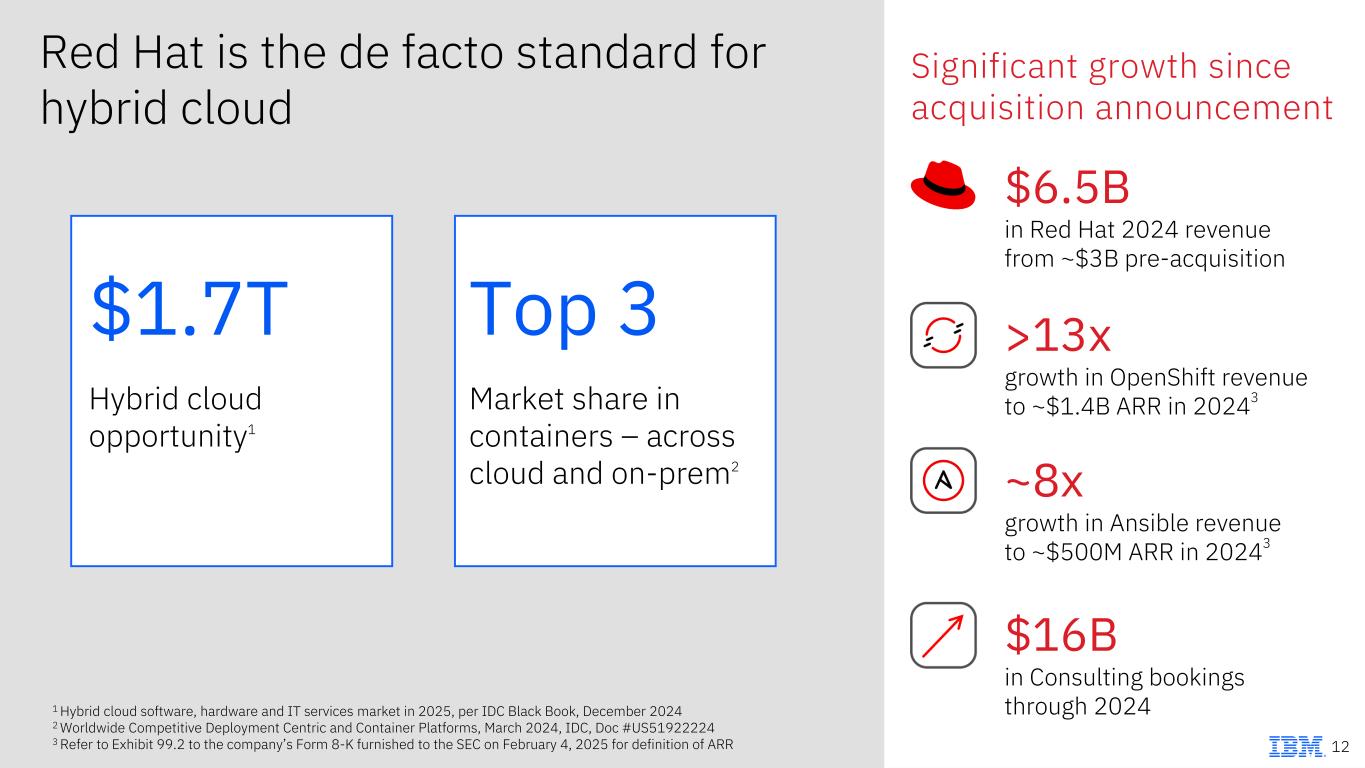 Red Hat is the de facto standard for hybrid cloud Significant growth since acquisition announcement $1.7T Hybrid cloud opportunity1 Top 3 Market share in containers – across cloud and on-prem2 1 Hybrid cloud software, hardware and IT services market in 2025, per IDC Black Book, December 2024 2 Worldwide Competitive Deployment Centric and Container Platforms, March 2024, IDC, Doc #US51922224 3 Refer to Exhibit 99.2 to the company’s Form 8-K furnished to the SEC on February 4, 2025 for definition of ARR $6.5B in Red Hat 2024 revenue from ~$3B pre-acquisition >13x growth in OpenShift revenue to ~$1.4B ARR in 2024 3 ~8x growth in Ansible revenue to ~$500M ARR in 2024 3 $16B in Consulting bookings through 2024 12