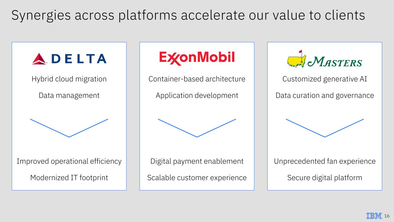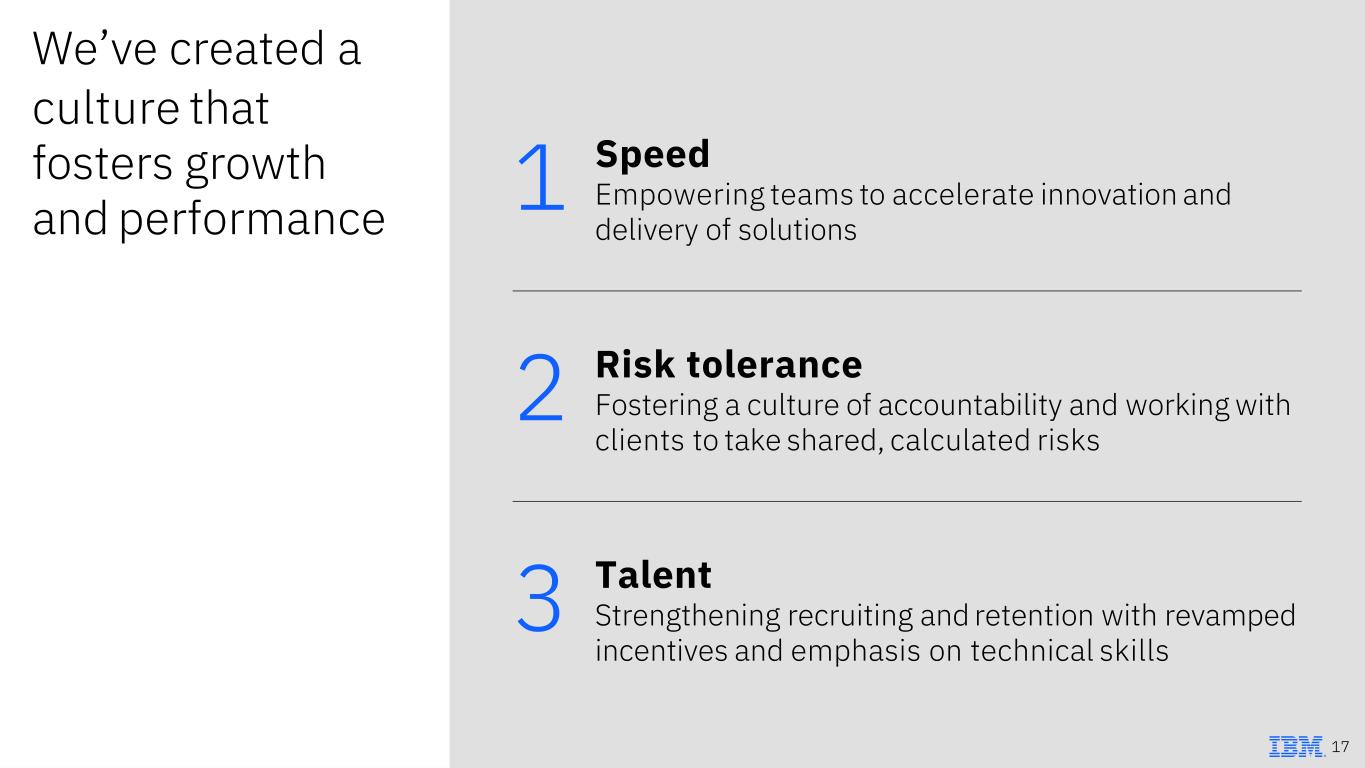 Synergies across platforms accelerate our value to clients Hybrid cloud migration Data management Improved operational efficiency Modernized IT footprint Container-based architecture Application development Digital payment enablement Scalable customer experience Customized generative AI Data curation and governance Unprecedented fan experience Secure digital platform 16