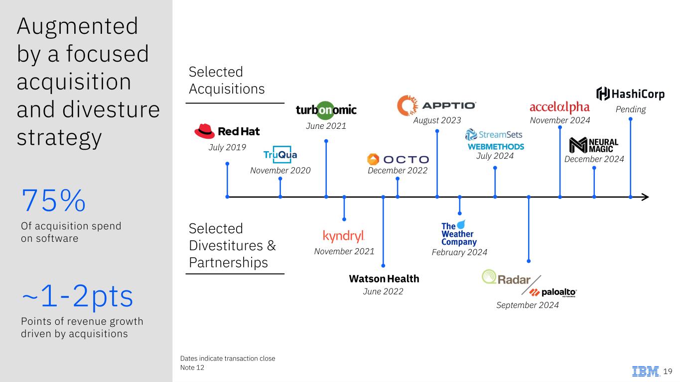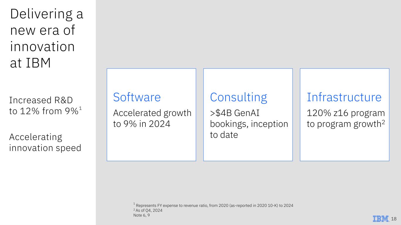 Delivering a new era of innovation at IBM Increased R&D to 12% from 9%1 Accelerating innovation speed 1 Represents FY expense to revenue ratio, from 2020 (as-reported in 2020 10-K) to 2024 2 As of Q4, 2024 Note 6, 9 18 Infrastructure 120% z16 program to program growth2 Consulting >$4B GenAI bookings, inception to date Software Accelerated growth to 9% in 2024
