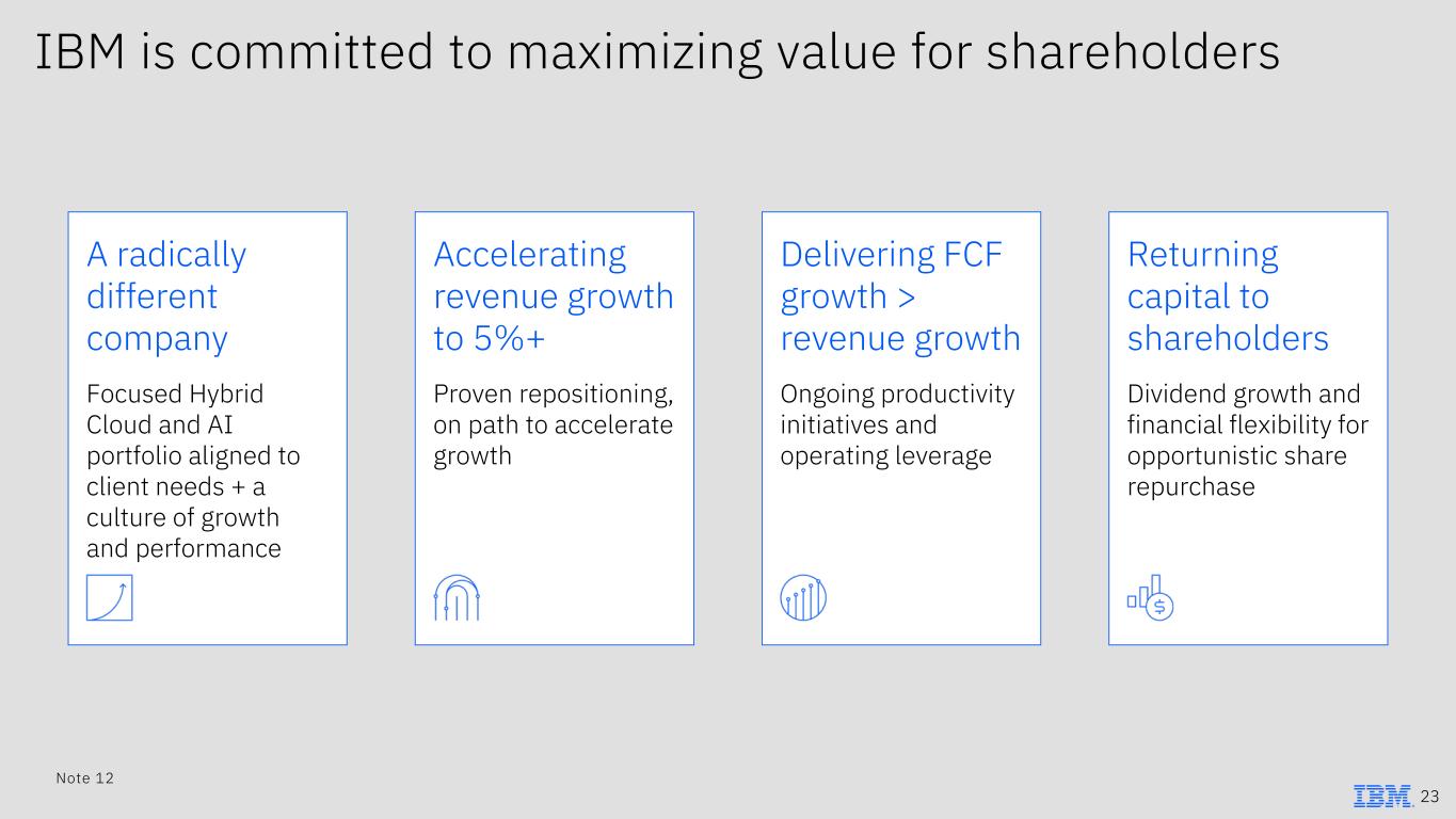 IBM is committed to maximizing value for shareholders A radically different company Focused Hybrid Cloud and AI portfolio aligned to client needs + a culture of growth and performance Accelerating revenue growth to 5%+ Proven repositioning, on path to accelerate growth Delivering FCF growth > revenue growth Ongoing productivity initiatives and operating leverage Returning capital to shareholders Dividend growth and financial flexibility for opportunistic share repurchase 23 Note 12