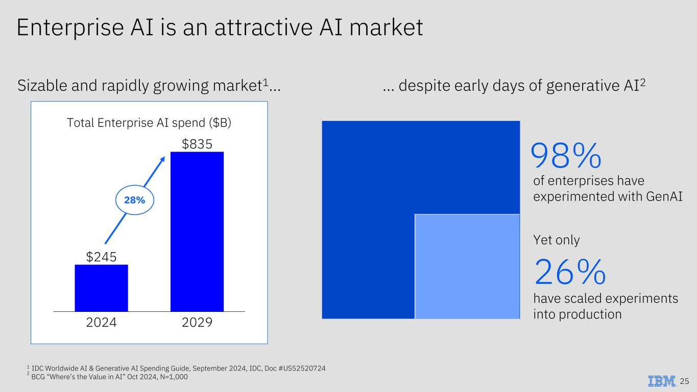 Enterprise AI is an attractive AI market Total Enterprise AI spend ($B) Sizable and rapidly growing market1… … despite early days of generative AI2 1 IDC Worldwide AI & Generative AI Spending Guide, September 2024, IDC, Doc #US52520724 2 BCG “Where’s the Value in AI” Oct 2024, N=1,000 25 of enterprises have experimented with GenAI 98% have scaled experiments into production 26% Yet only