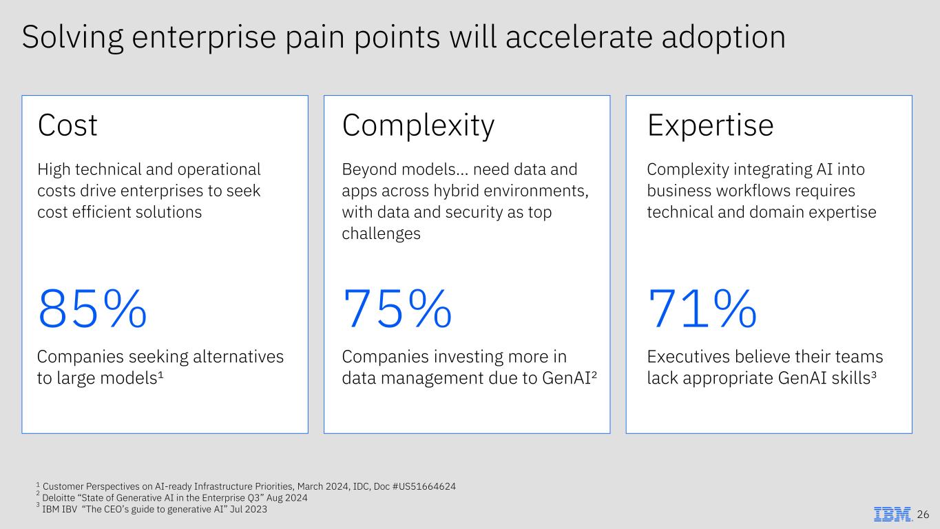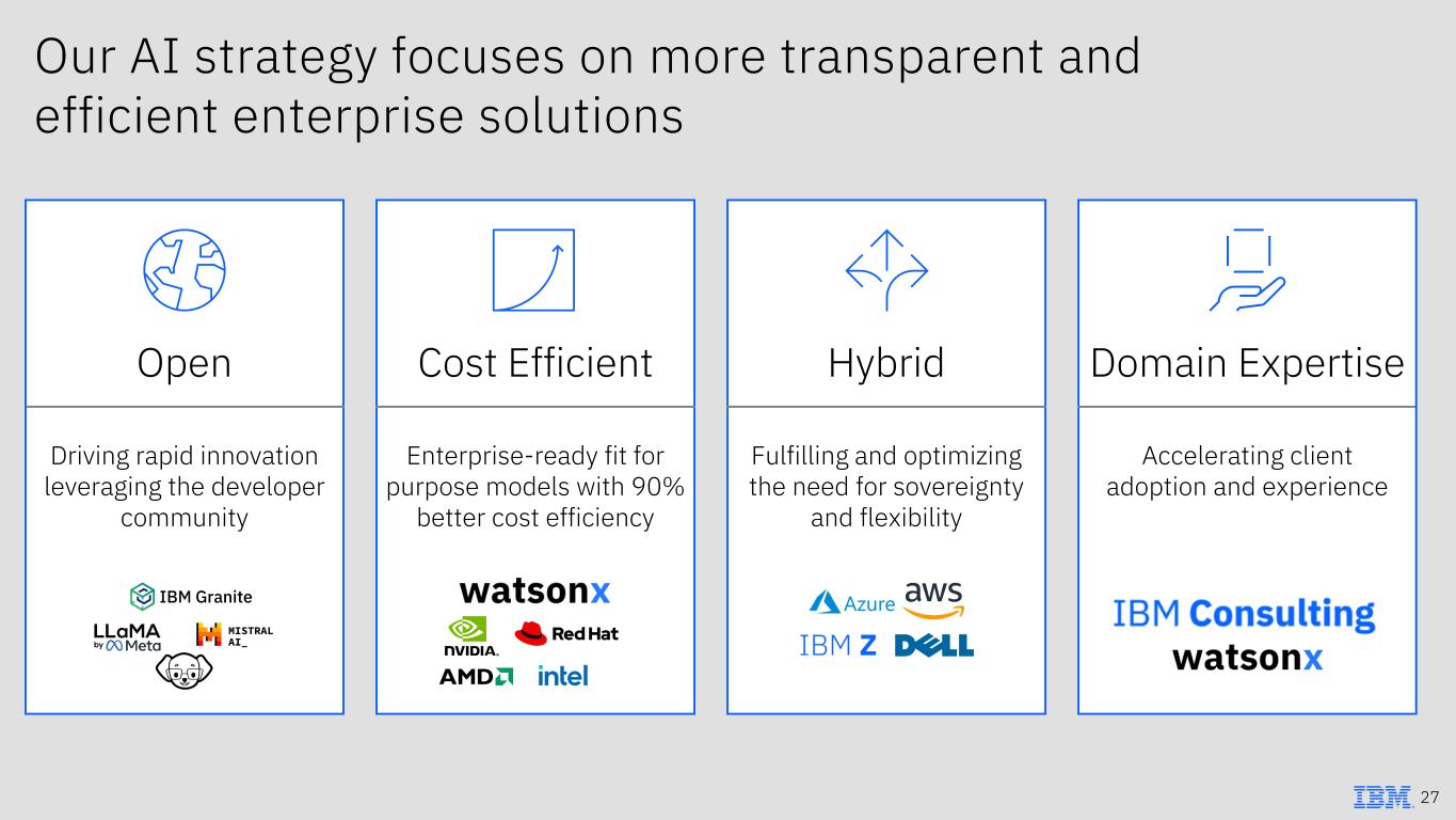 Solving enterprise pain points will accelerate adoption 1 Customer Perspectives on AI-ready Infrastructure Priorities, March 2024, IDC, Doc #US51664624 2 Deloitte “State of Generative AI in the Enterprise Q3” Aug 2024 3 IBM IBV “The CEO’s guide to generative AI” Jul 2023 26 85% Companies seeking alternatives to large models¹ Cost High technical and operational costs drive enterprises to seek cost efficient solutions 75% Companies investing more in data management due to GenAI² Complexity Beyond models… need data and apps across hybrid environments, with data and security as top challenges 71% Executives believe their teams lack appropriate GenAI skills³ Expertise Complexity integrating AI into business workflows requires technical and domain expertise