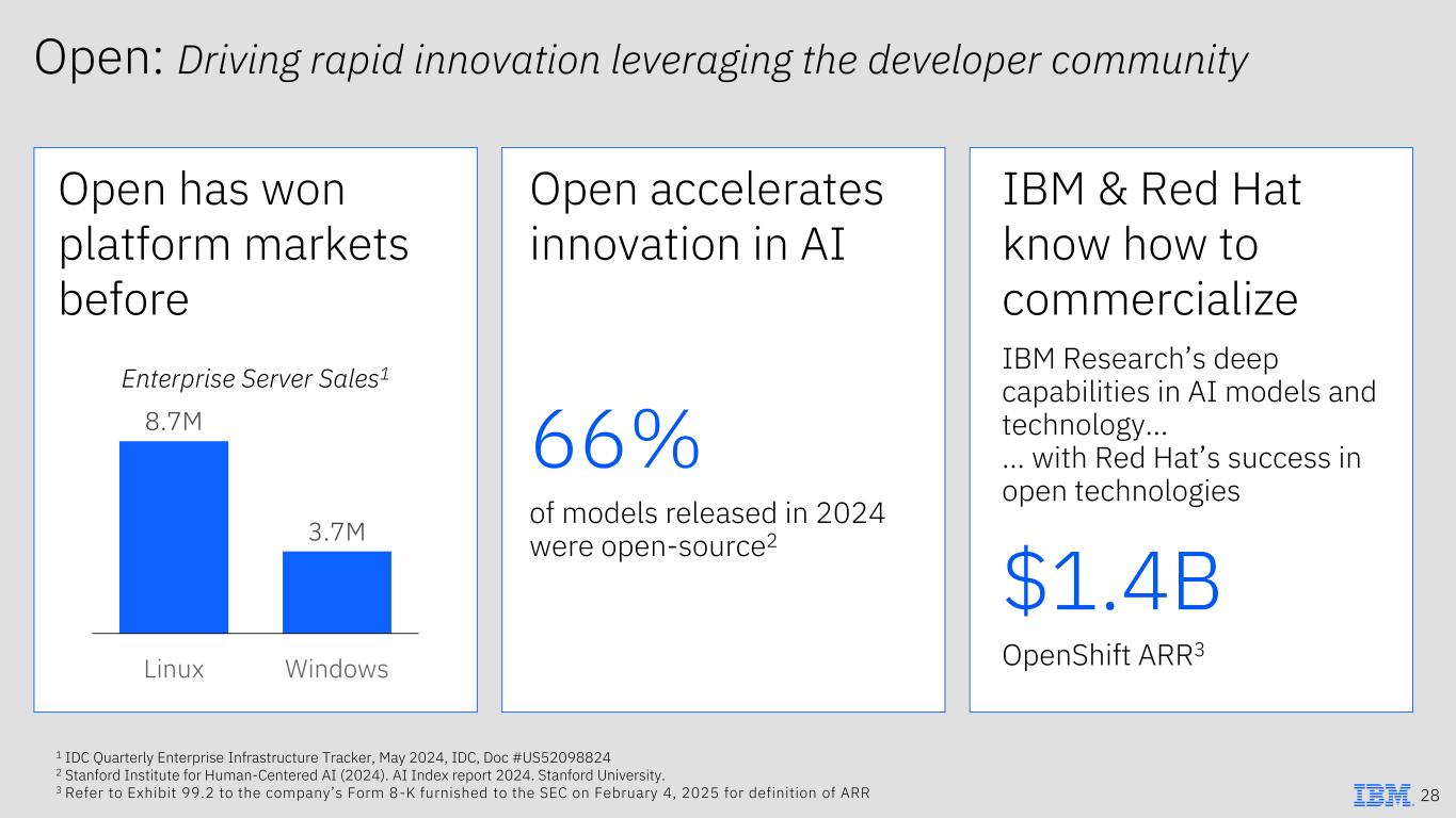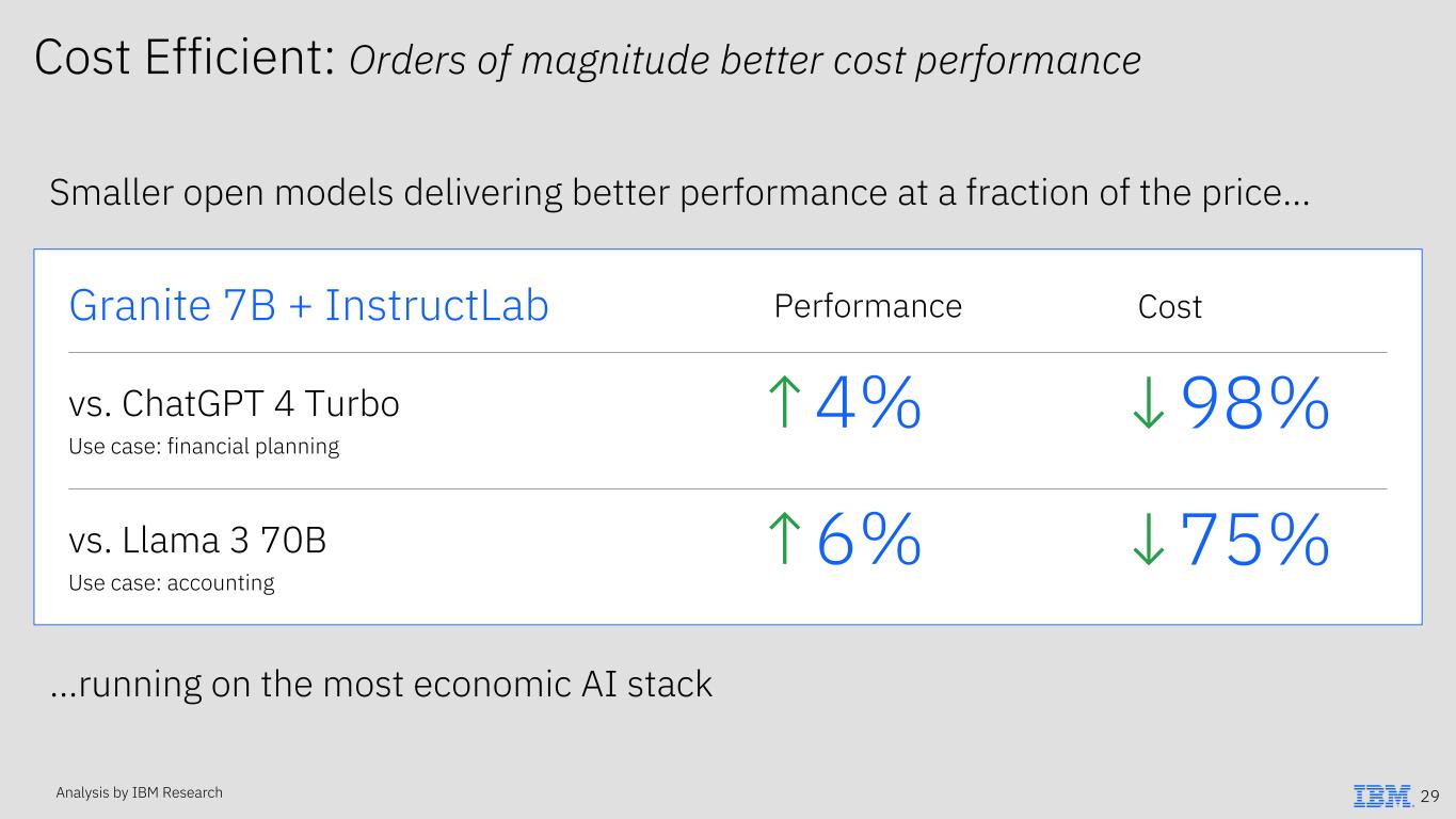 Open: Driving rapid innovation leveraging the developer community 1 IDC Quarterly Enterprise Infrastructure Tracker, May 2024, IDC, Doc #US52098824 2 Stanford Institute for Human-Centered AI (2024). AI Index report 2024. Stanford University. 3 Refer to Exhibit 99.2 to the company’s Form 8-K furnished to the SEC on February 4, 2025 for definition of ARR 28 Open has won platform markets before 66% of models released in 2024 were open-source2 Open accelerates innovation in AI $1.4B OpenShift ARR3 IBM & Red Hat know how to commercialize Enterprise Server Sales1 IBM Research’s deep capabilities in AI models and technology… … with Red Hat’s success in open technologies