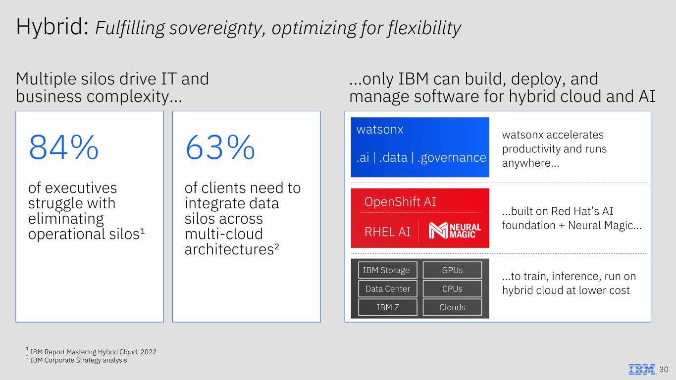Hybrid: Fulfilling sovereignty, optimizing for flexibility 1 IBM Report Mastering Hybrid Cloud, 2022 2 IBM Corporate Strategy analysis 30 Multiple silos drive IT and business complexity… 84% 63% of executives struggle with eliminating operational silos¹ of clients need to integrate data silos across multi-cloud architectures² …only IBM can build, deploy, and manage software for hybrid cloud and AI watsonx .ai | .data | .governance OpenShift AI RHEL AI watsonx accelerates productivity and runs anywhere… …built on Red Hat’s AI foundation + Neural Magic… …to train, inference, run on hybrid cloud at lower cost IBM Z IBM Storage Clouds GPUs Data Center CPUs