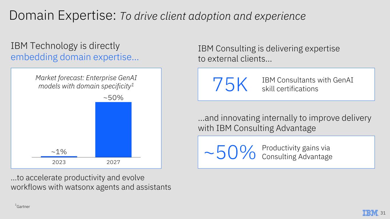 Domain Expertise: To drive client adoption and experience IBM Technology is directly embedding domain expertise… Market forecast: Enterprise GenAI models with domain specificity1 …to accelerate productivity and evolve workflows with watsonx agents and assistants 1 Gartner 31 IBM Consulting is delivering expertise to external clients… …and innovating internally to improve delivery with IBM Consulting Advantage 75K ~50% IBM Consultants with GenAI skill certifications Productivity gains via Consulting Advantage