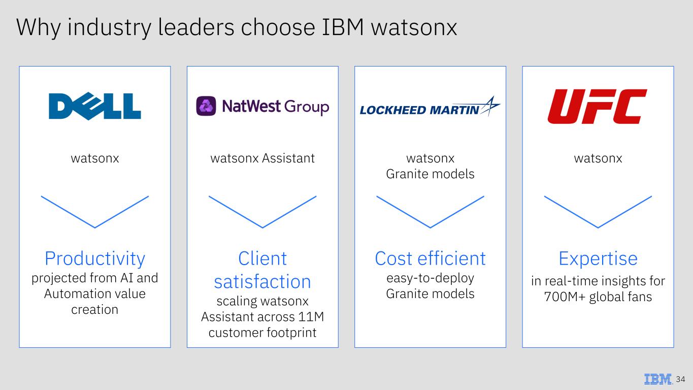 Why industry leaders choose IBM watsonx watsonx 34 watsonx Assistant watsonx Granite models watsonx Client satisfaction scaling watsonx Assistant across 11M customer footprint Productivity projected from AI and Automation value creation Cost efficient easy-to-deploy Granite models Expertise in real-time insights for 700M+ global fans