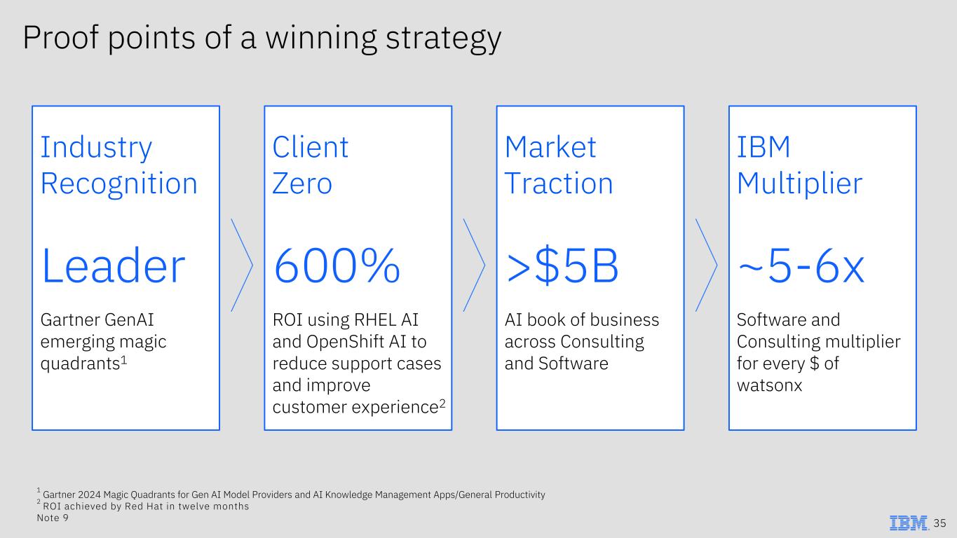 Proof points of a winning strategy Market Traction IBM Multiplier >$5B AI book of business across Consulting and Software ~5-6x Software and Consulting multiplier for every $ of watsonx 1 Gartner 2024 Magic Quadrants for Gen AI Model Providers and AI Knowledge Management Apps/General Productivity 2 ROI achieved by Red Hat in twelve months Note 9 Client Zero 600% ROI using RHEL AI and OpenShift AI to reduce support cases and improve customer experience2 Industry Recognition Leader Gartner GenAI emerging magic quadrants1 35