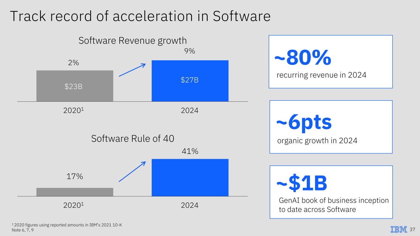 Track record of acceleration in Software ~80% recurring revenue in 2024 ~6pts organic growth in 2024 ~$1B GenAI book of business inception to date across Software 1 2020 figures using reported amounts in IBM’s 2021 10-K Note 6, 7, 9 Software Revenue growth 20201 2024 17% 41% Software Rule of 40 20201 2024 2% 9% $23B $27B 37