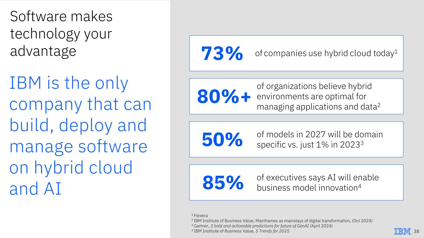 Software makes technology your advantage of organizations believe hybrid environments are optimal for managing applications and data2 80%+ 73% of companies use hybrid cloud today1 of models in 2027 will be domain specific vs. just 1% in 2023350% of executives says AI will enable business model innovation485% IBM is the only company that can build, deploy and manage software on hybrid cloud and AI 1 Flexera 2 IBM Institute of Business Value, Mainframes as mainstays of digital transformation, (Oct 2024) 3 Gartner, 3 bold and actionable predictions for future of GenAI (April 2024) 4 IBM Institute of Business Value, 5 Trends for 2025 38
