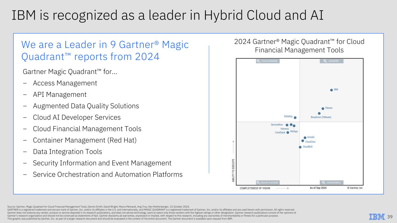 IBM is recognized as a leader in Hybrid Cloud and AI Gartner Magic Quadrant for… − Access Management − API Management − Augmented Data Quality Solutions − Cloud AI Developer Services − Cloud Financial Management Tools − Container Management (Red Hat) − Data Integration Tools − Security Information and Event Management − Service Orchestration and Automation Platforms We are a Leader in 9 Gartner® Magic Quadrant reports from 2024 Source: Gartner, Magic Quadrant for Cloud Financial Management Tools, Dennis Smith, David Wright, Marco Meinardi, Ang Troy, Ken Rothenberger, 15 October 2024. GARTNER is a registered trademark and service mark of Gartner, Inc. and/or its affiliates in the U.S. and internationally, and MAGIC QUADRANT is a registered trademark of Gartner, Inc. and/or its affiliates and are used herein with permission. All rights reserved. Gartner does not endorse any vendor, product or service depicted in its research publications, and does not advise technology users to select only those vendors with the highest ratings or other designation. Gartner research publications consist of the opinions of Gartner’s research organization and should not be construed as statements of fact. Gartner disclaims all warranties, expressed or implied, with respect to this research, including any warranties of merchantability or fitness for a particular purpose. This graphic was published by Gartner, Inc. as part of a larger research document and should be evaluated in the context of the entire document. The Gartner document is available upon request from IBM. 39 2024 Gartner® Magic Quadrant for Cloud Financial Management Tools