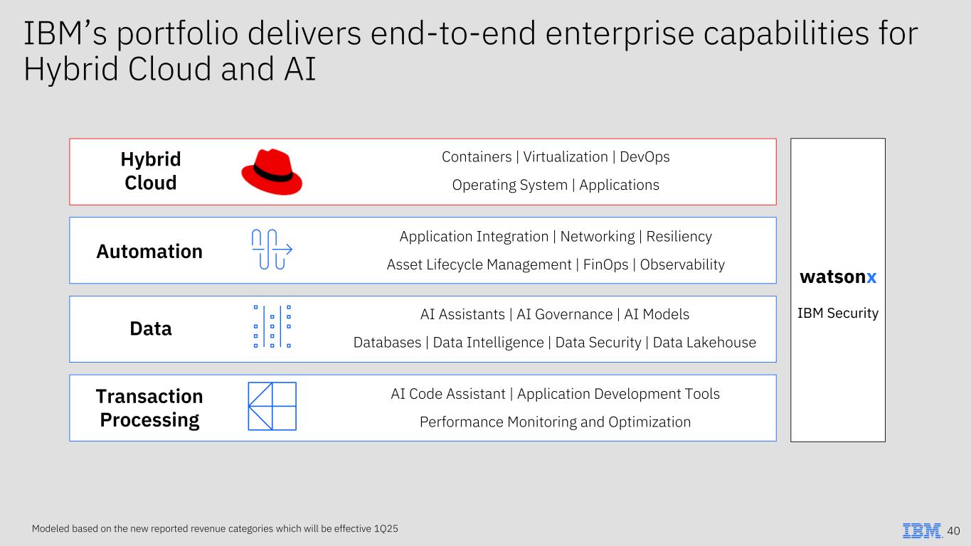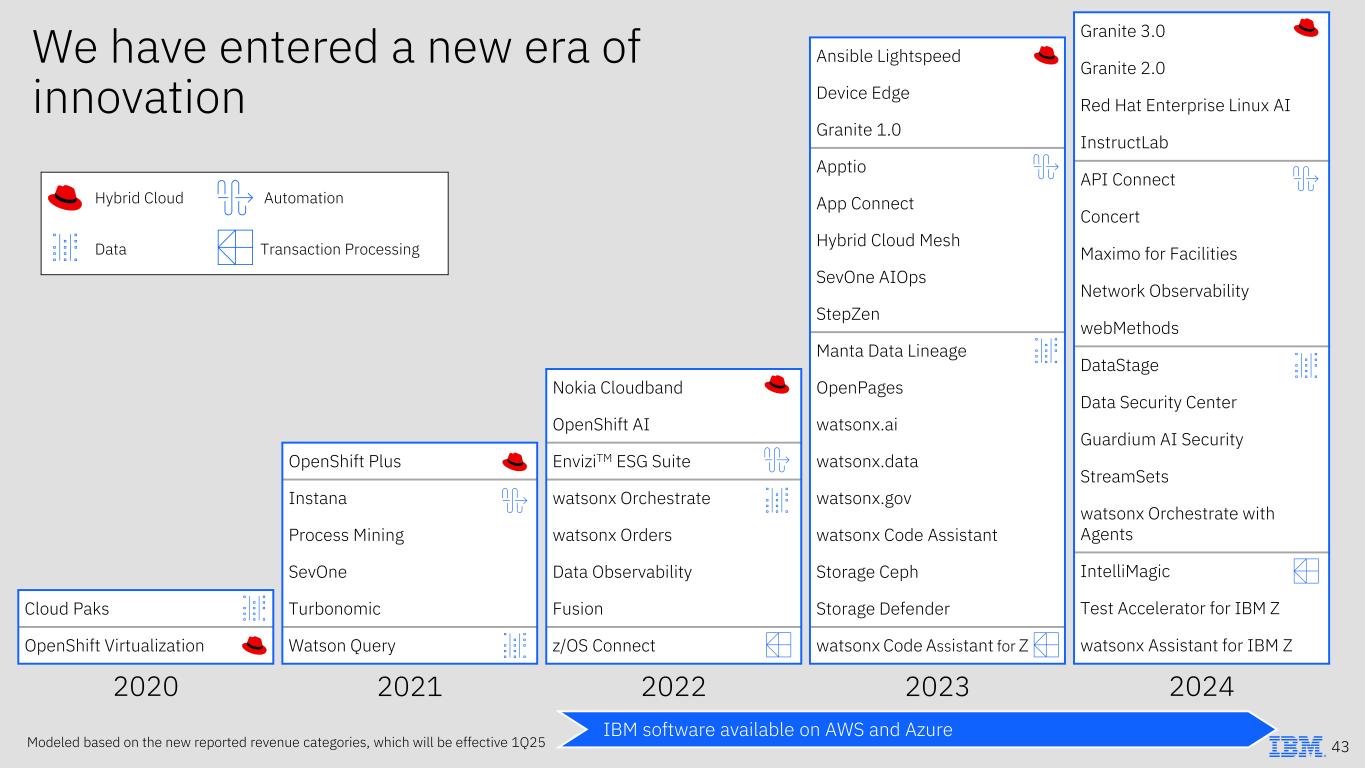 Ansible Lightspeed Device Edge Granite 1.0 Apptio App Connect Hybrid Cloud Mesh SevOne AIOps StepZen Manta Data Lineage OpenPages watsonx.ai watsonx.data watsonx.gov watsonx Code Assistant Storage Ceph Storage Defender watsonx Code Assistant for Z Hybrid Cloud Automation Data Transaction Processing We have entered a new era of innovation Granite 3.0 Granite 2.0 Red Hat Enterprise Linux AI InstructLab API Connect Concert Maximo for Facilities Network Observability webMethods DataStage Data Security Center Guardium AI Security StreamSets watsonx Orchestrate with Agents IntelliMagic Test Accelerator for IBM Z watsonx Assistant for IBM Z Nokia Cloudband OpenShift AI EnviziTM ESG Suite watsonx Orchestrate watsonx Orders Data Observability Fusion z/OS Connect OpenShift Plus Instana Process Mining SevOne Turbonomic Watson Query Cloud Paks OpenShift Virtualization 2020 2021 2022 2023 2024 IBM software available on AWS and Azure 43Modeled based on the new reported revenue categories, which will be effective 1Q25