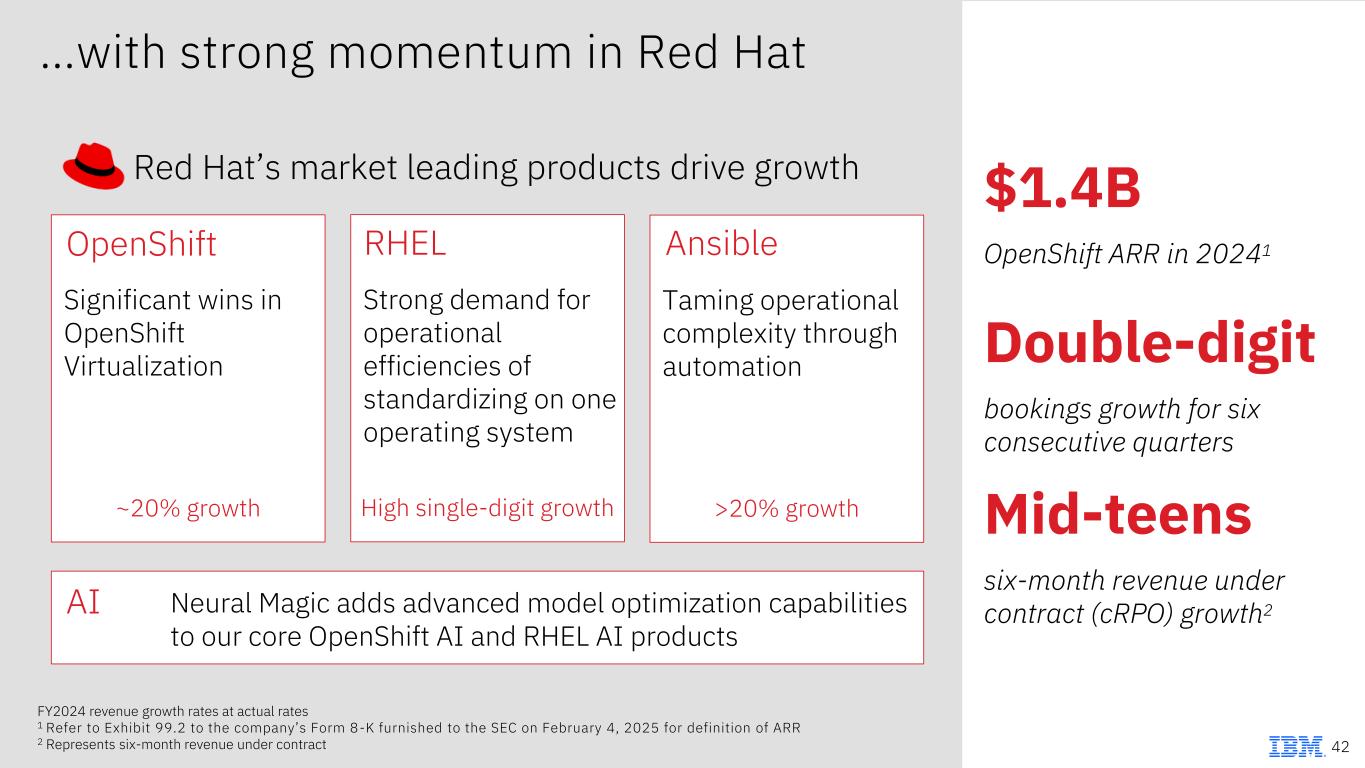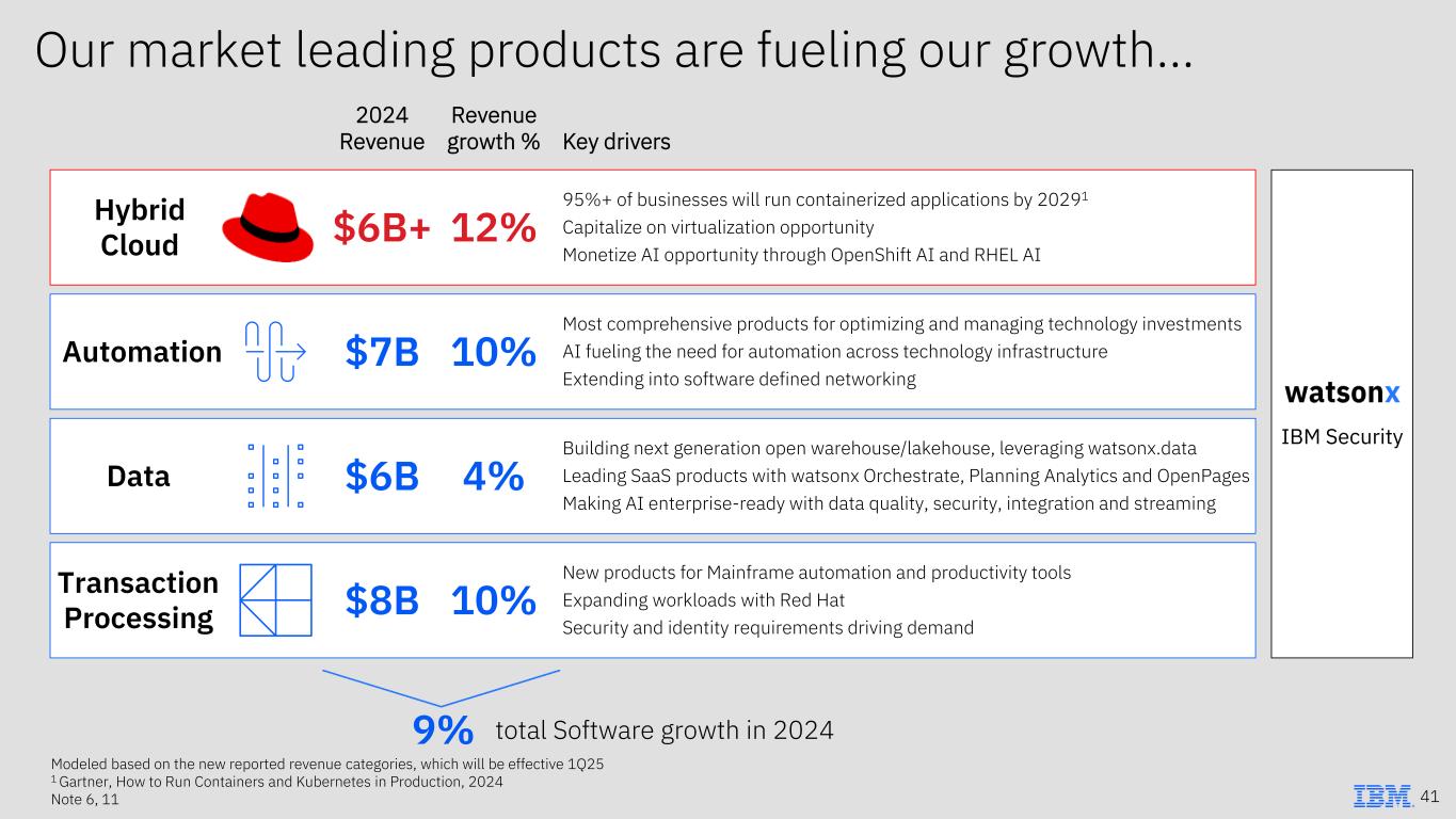 Our market leading products are fueling our growth… 2024 Revenue Key drivers Revenue growth % Modeled based on the new reported revenue categories, which will be effective 1Q25 1 Gartner, How to Run Containers and Kubernetes in Production, 2024 Note 6, 11 9% total Software growth in 2024 41 Hybrid Cloud $6B+ 12% 95%+ of businesses will run containerized applications by 20291 Capitalize on virtualization opportunity Monetize AI opportunity through OpenShift AI and RHEL AI Automation $7B 10% Most comprehensive products for optimizing and managing technology investments AI fueling the need for automation across technology infrastructure Extending into software defined networking Data $6B 4% Building next generation open warehouse/lakehouse, leveraging watsonx.data Leading SaaS products with watsonx Orchestrate, Planning Analytics and OpenPages Making AI enterprise-ready with data quality, security, integration and streaming Transaction Processing $8B 10% New products for Mainframe automation and productivity tools Expanding workloads with Red Hat Security and identity requirements driving demand IBM Security
