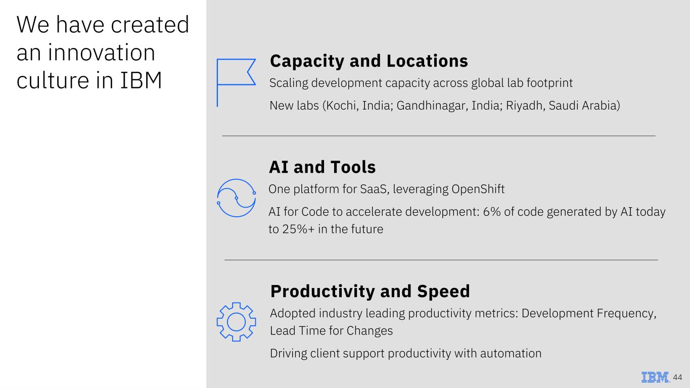 We have created an innovation culture in IBM AI and Tools One platform for SaaS, leveraging OpenShift AI for Code to accelerate development: 6% of code generated by AI today to 25%+ in the future Productivity and Speed Adopted industry leading productivity metrics: Development Frequency, Lead Time for Changes Driving client support productivity with automation Capacity and Locations Scaling development capacity across global lab footprint New labs (Kochi, India; Gandhinagar, India; Riyadh, Saudi Arabia) 44