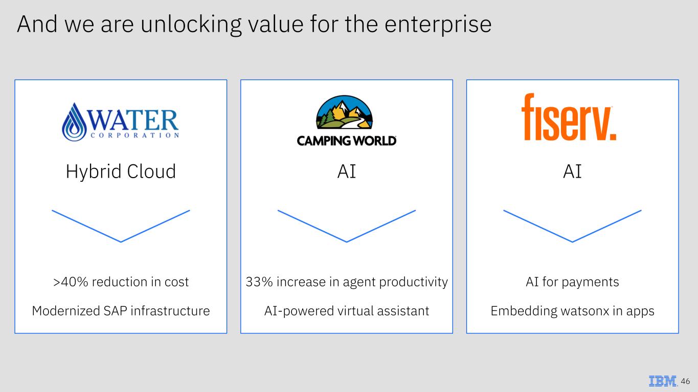 And we are unlocking value for the enterprise 46 AI 33% increase in agent productivity AI-powered virtual assistant Hybrid Cloud >40% reduction in cost Modernized SAP infrastructure AI AI for payments Embedding watsonx in apps