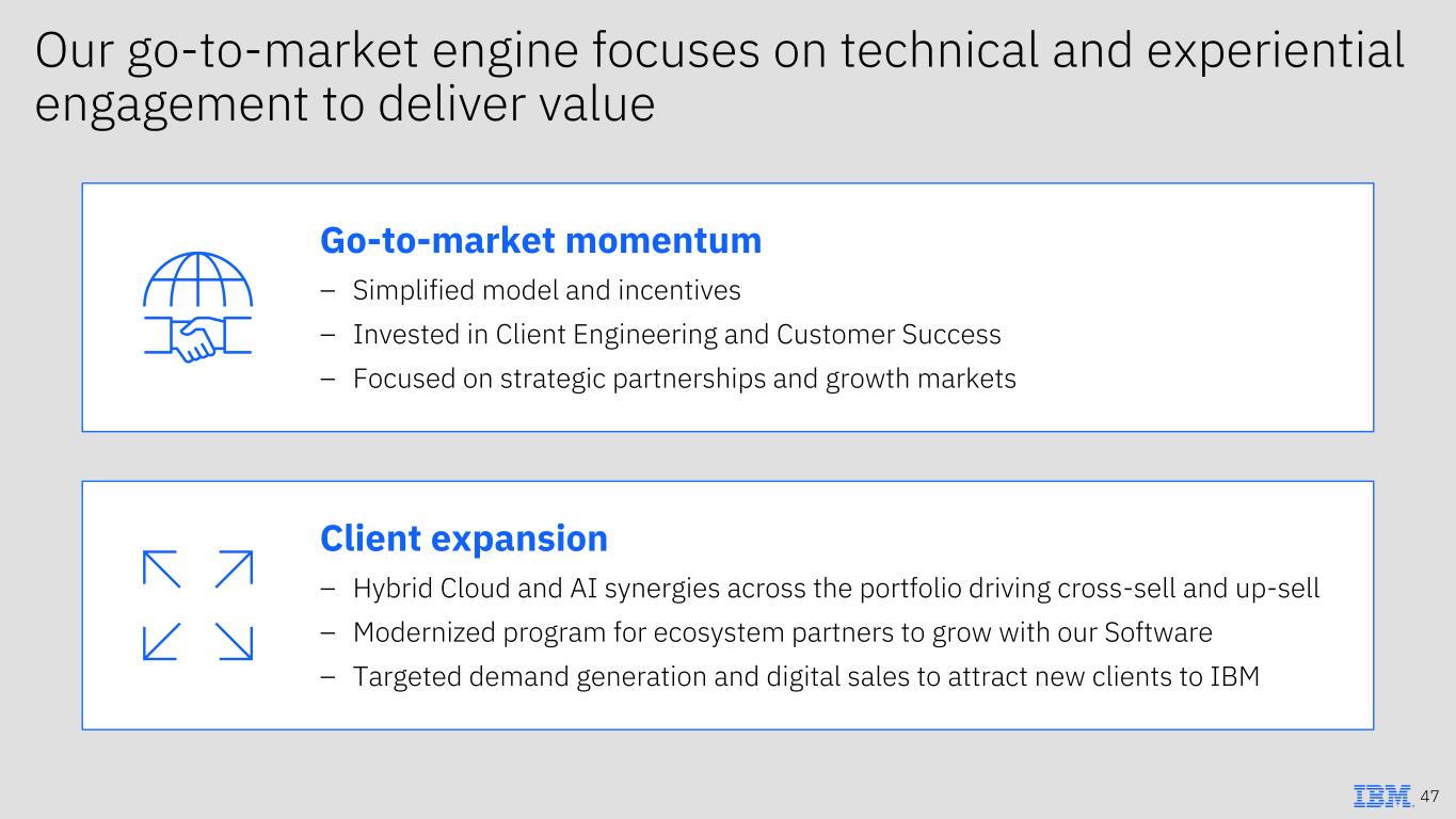 Our go-to-market engine focuses on technical and experiential engagement to deliver value Go-to-market momentum – Simplified model and incentives – Invested in Client Engineering and Customer Success – Focused on strategic partnerships and growth markets Client expansion – Hybrid Cloud and AI synergies across the portfolio driving cross-sell and up-sell – Modernized program for ecosystem partners to grow with our Software – Targeted demand generation and digital sales to attract new clients to IBM 47