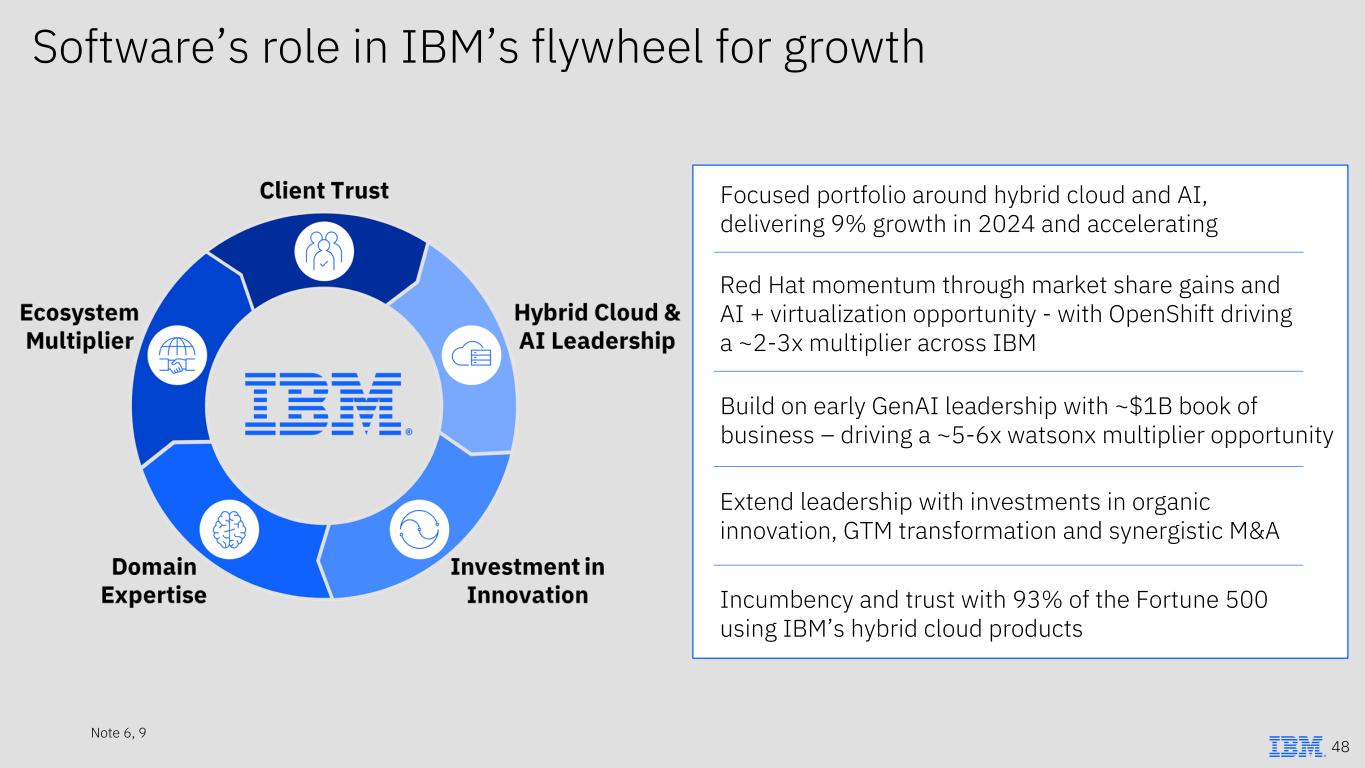 Build on early GenAI leadership with ~$1B book of business – driving a ~5-6x watsonx multiplier opportunity Software’s role in IBM’s flywheel for growth Focused portfolio around hybrid cloud and AI, delivering 9% growth in 2024 and accelerating Red Hat momentum through market share gains and AI + virtualization opportunity - with OpenShift driving a ~2-3x multiplier across IBM Incumbency and trust with 93% of the Fortune 500 using IBM’s hybrid cloud products Extend leadership with investments in organic innovation, GTM transformation and synergistic M&A 48 Note 6, 9