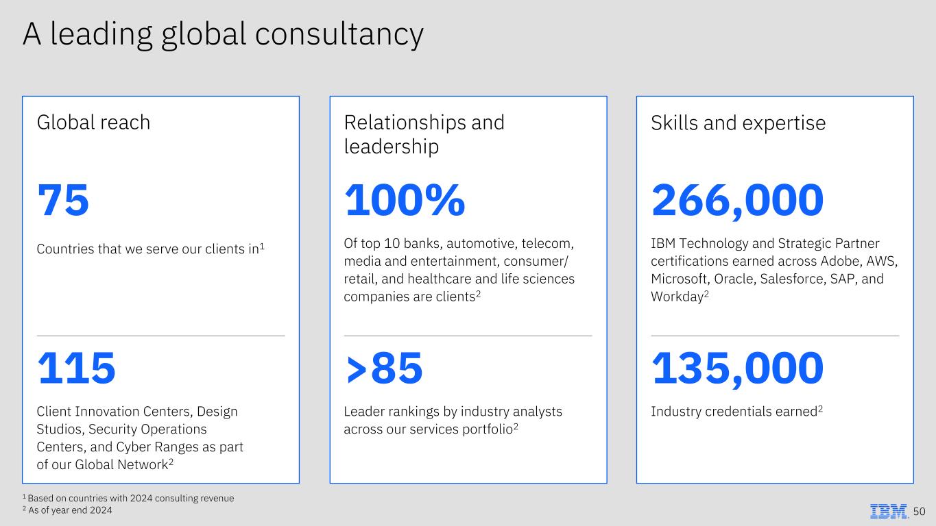 A leading global consultancy 75 115 266,000 135,000 100% >85 Countries that we serve our clients in1 Client Innovation Centers, Design Studios, Security Operations Centers, and Cyber Ranges as part of our Global Network2 IBM Technology and Strategic Partner certifications earned across Adobe, AWS, Microsoft, Oracle, Salesforce, SAP, and Workday2 Industry credentials earned2 Of top 10 banks, automotive, telecom, media and entertainment, consumer/ retail, and healthcare and life sciences companies are clients2 Leader rankings by industry analysts across our services portfolio2 Global reach Relationships and leadership Skills and expertise 1 Based on countries with 2024 consulting revenue 2 As of year end 2024 50