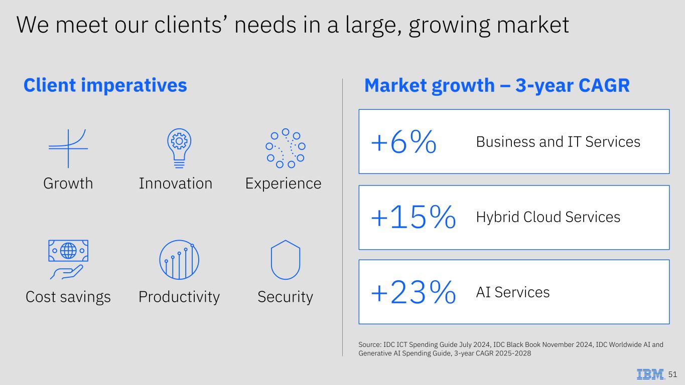 We meet our clients’ needs in a large, growing market Client imperatives Market growth – 3-year CAGR Productivity Innovation Experience Security Source: IDC ICT Spending Guide July 2024, IDC Black Book November 2024, IDC Worldwide AI and Generative AI Spending Guide, 3-year CAGR 2025-2028 Growth Cost savings 51 +6% Business and IT Services +15% Hybrid Cloud Services +23% AI Services