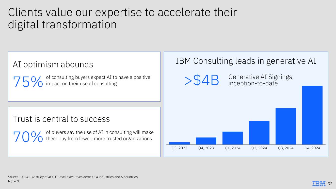 Clients value our expertise to accelerate their digital transformation 75% of consulting buyers expect AI to have a positive impact on their use of consulting >$4B Generative AI Signings, inception-to-date AI optimism abounds 70% of buyers say the use of AI in consulting will make them buy from fewer, more trusted organizations Trust is central to success IBM Consulting leads in generative AI Source: 2024 IBV study of 400 C-level executives across 14 industries and 6 countries Note 9 52