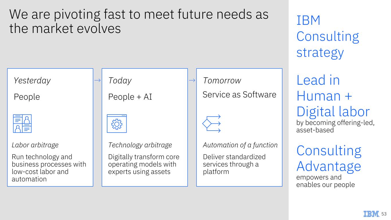 Automation of a function Deliver standardized services through a platform We are pivoting fast to meet future needs as the market evolves People + AI Technology arbitrage Digitally transform core operating models with experts using assets Service as Software Yesterday Today Tomorrow→ → IBM Consulting strategy Lead in Human + Digital labor by becoming offering-led, asset-based Consulting Advantage empowers and enables our people People Labor arbitrage Run technology and business processes with low-cost labor and automation 53