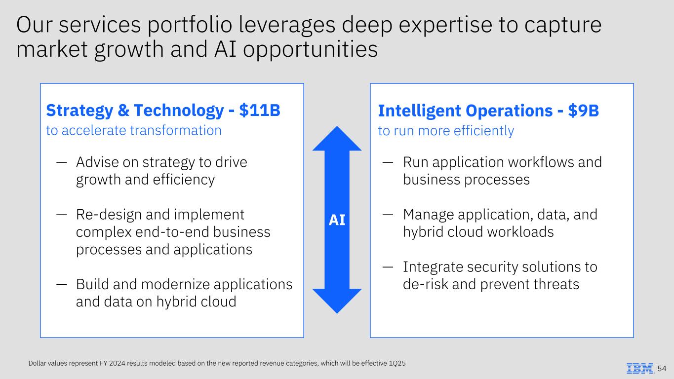 Strategy & Technology - $11B to accelerate transformation Intelligent Operations - $9B to run more efficiently Run application workflows and business processes Manage application, data, and hybrid cloud workloads Integrate security solutions to de-risk and prevent threats Advise on strategy to drive growth and efficiency Re-design and implement complex end-to-end business processes and applications Build and modernize applications and data on hybrid cloud — — — — — — Dollar values represent FY 2024 results modeled based on the new reported revenue categories, which will be effective 1Q25 AI Our services portfolio leverages deep expertise to capture market growth and AI opportunities 54