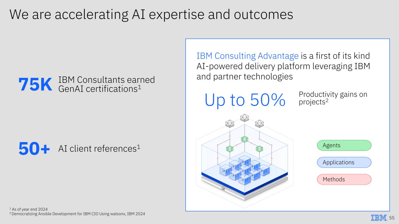 1 As of year end 2024 2 Democratizing Ansible Development for IBM CIO Using watsonx, IBM 2024 75K IBM Consultants earned GenAI certifications1 50+ AI client references1 Agents Applications Methods IBM Consulting Advantage is a first of its kind AI-powered delivery platform leveraging IBM and partner technologies Up to 50% Productivity gains on projects2 We are accelerating AI expertise and outcomes 55