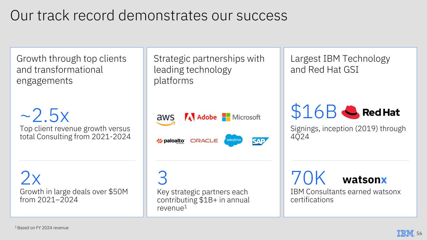 Largest IBM Technology and Red Hat GSI IBM Consultants earned watsonx certifications 70K $16B Signings, inception (2019) through 4Q24 Strategic partnerships with leading technology platforms Key strategic partners each contributing $1B+ in annual revenue1 3 Growth through top clients and transformational engagements Top client revenue growth versus total Consulting from 2021-2024 Growth in large deals over $50M from 2021–2024 ~2.5x 2x 1 Based on FY 2024 revenue Our track record demonstrates our success 56