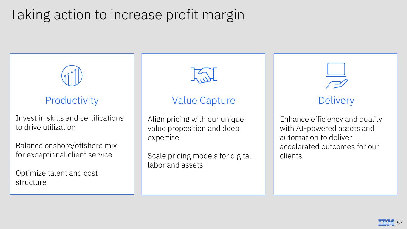 DeliveryValue Capture Align pricing with our unique value proposition and deep expertise Scale pricing models for digital labor and assets Enhance efficiency and quality with AI-powered assets and automation to deliver accelerated outcomes for our clients Productivity Invest in skills and certifications to drive utilization Balance onshore/offshore mix for exceptional client service Optimize talent and cost structure Taking action to increase profit margin 57