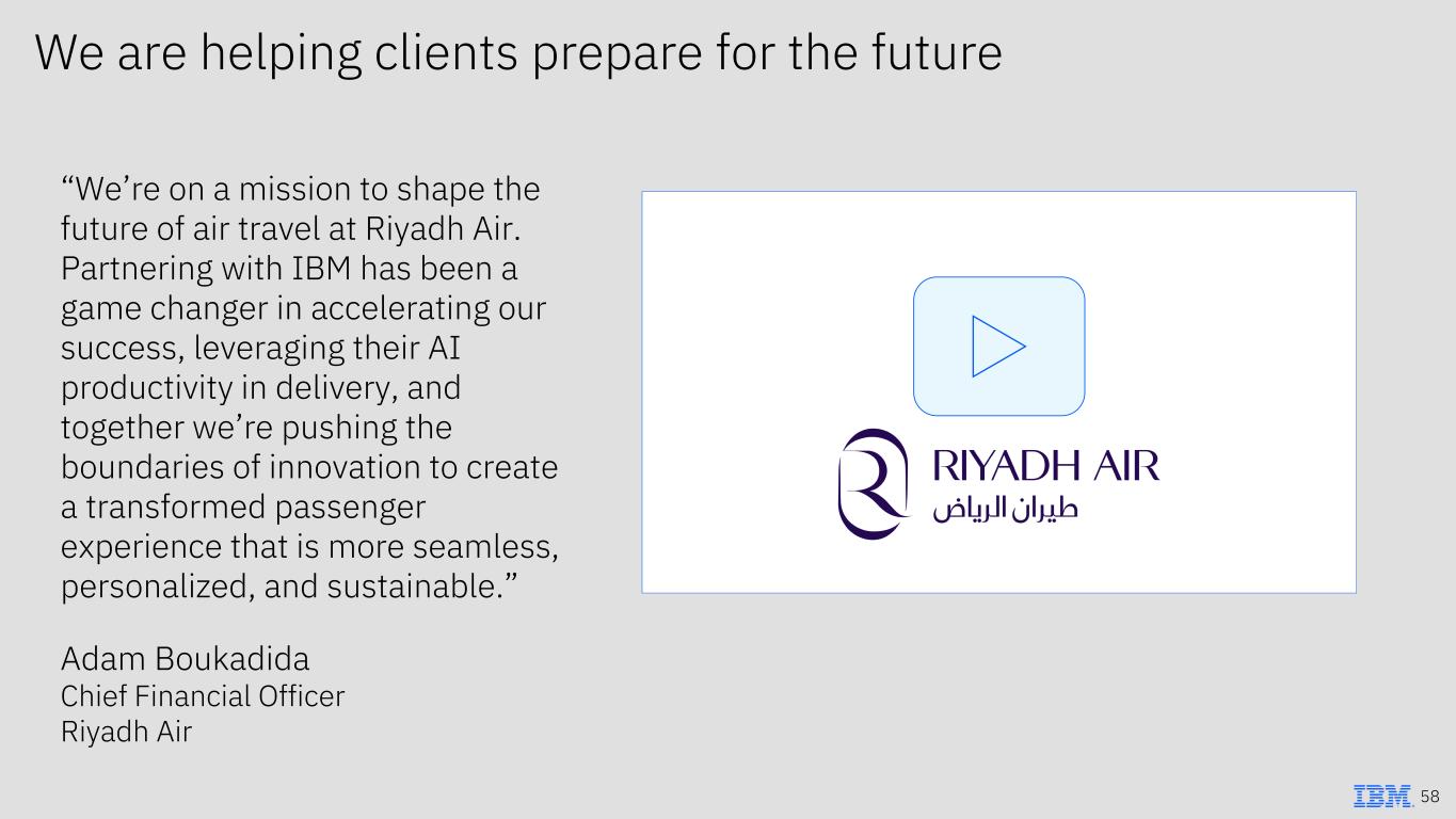 We are helping clients prepare for the future “We’re on a mission to shape the future of air travel at Riyadh Air. Partnering with IBM has been a game changer in accelerating our success, leveraging their AI productivity in delivery, and together we’re pushing the boundaries of innovation to create a transformed passenger experience that is more seamless, personalized, and sustainable.” Adam Boukadida Chief Financial Officer Riyadh Air 58