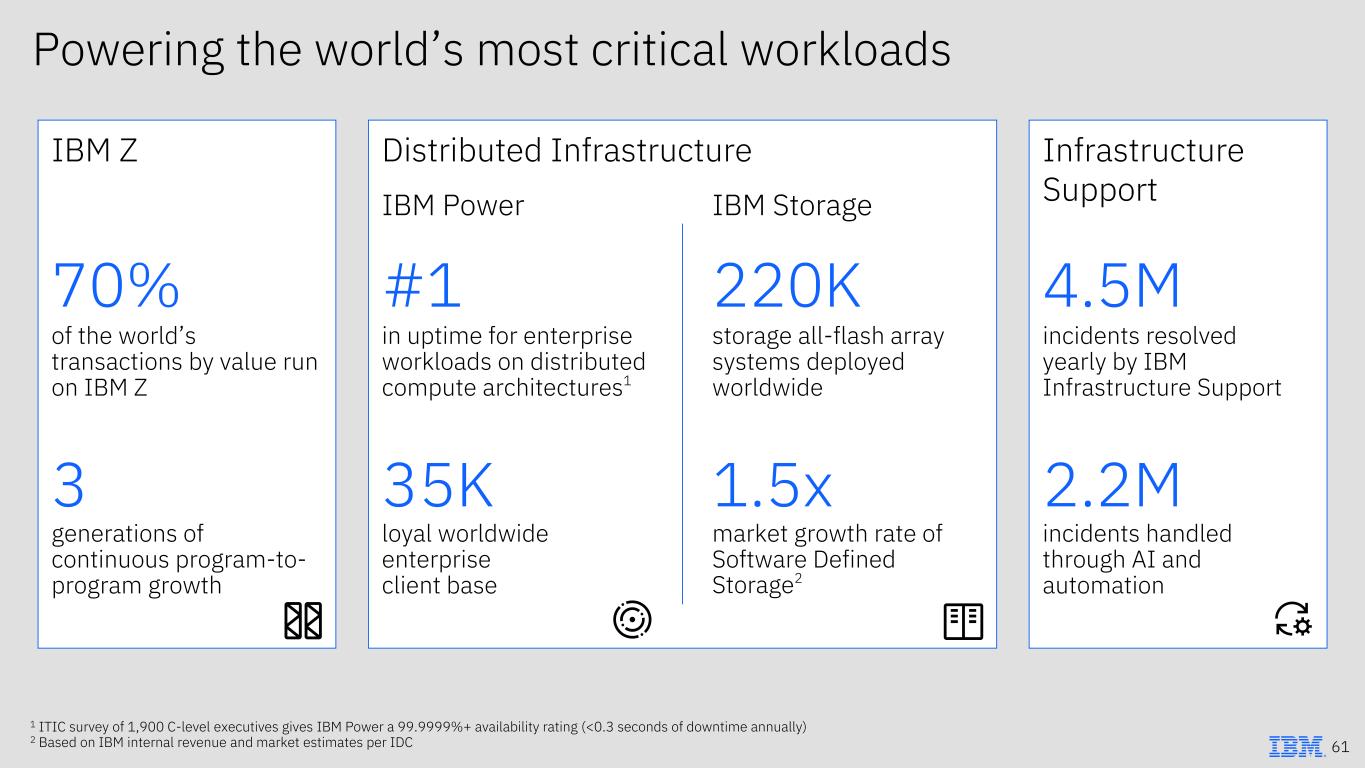 IBM Z IBM Storage Infrastructure SupportIBM Power 70% 3 generations of continuous program-to- program growth of the world’s transactions by value run on IBM Z #1 in uptime for enterprise workloads on distributed compute architectures1 220K storage all-flash array systems deployed worldwide 4.5M incidents resolved yearly by IBM Infrastructure Support 35K loyal worldwide enterprise client base 1.5x market growth rate of Software Defined Storage2 2.2M incidents handled through AI and automation 1 ITIC survey of 1,900 C-level executives gives IBM Power a 99.9999%+ availability rating (<0.3 seconds of downtime annually) 2 Based on IBM internal revenue and market estimates per IDC Powering the world’s most critical workloads 61 Distributed Infrastructure