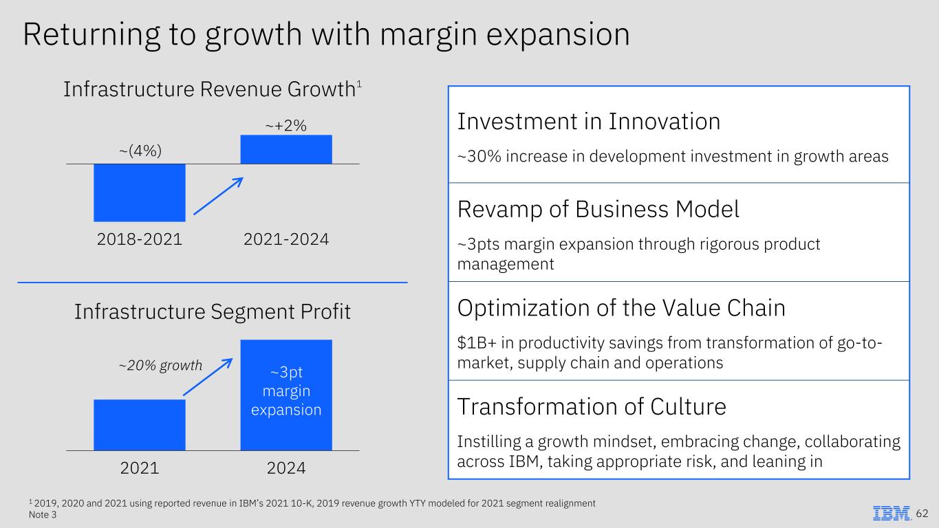 Investment in Innovation ~30% increase in development investment in growth areas Revamp of Business Model ~3pts margin expansion through rigorous product management Optimization of the Value Chain $1B+ in productivity savings from transformation of go-to- market, supply chain and operations Transformation of Culture Instilling a growth mindset, embracing change, collaborating across IBM, taking appropriate risk, and leaning in 2018-2021 2021-2024 ~(4%) ~+2% 2021 2024 ~20% growth ~3pt margin expansion 1 2019, 2020 and 2021 using reported revenue in IBM’s 2021 10-K, 2019 revenue growth YTY modeled for 2021 segment realignment Note 3 Returning to growth with margin expansion Infrastructure Revenue Growth1 Infrastructure Segment Profit 62