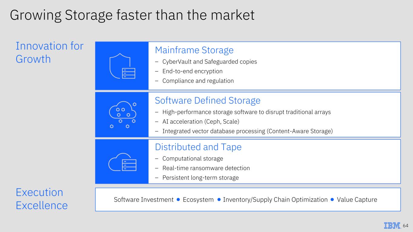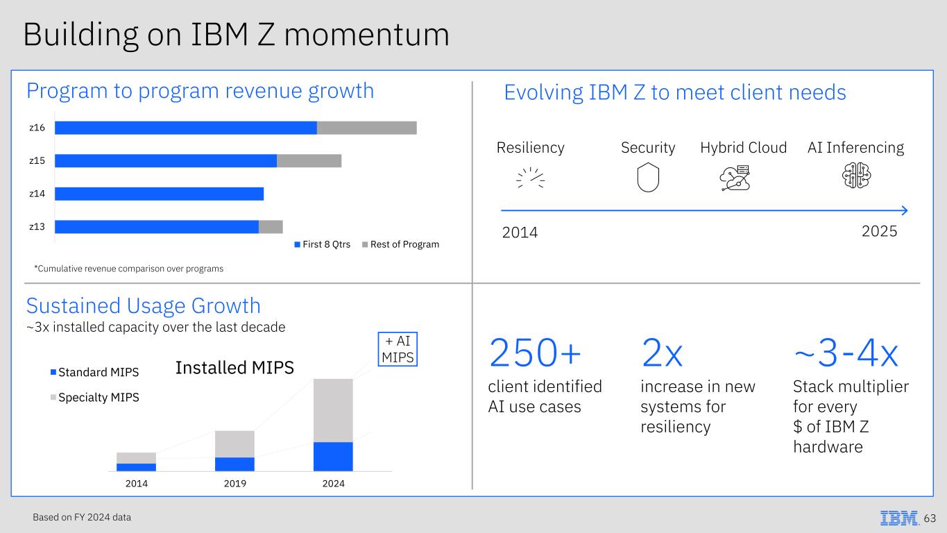 Sustained Usage Growth ~3x installed capacity over the last decade Evolving IBM Z to meet client needs 250+ client identified AI use cases Program to program revenue growth *Cumulative revenue comparison over programs 2014 2019 2024 Installed MIPSStandard MIPS Specialty MIPS z13 z14 z15 z16 First 8 Qtrs Rest of Program Based on FY 2024 data + AI MIPS Building on IBM Z momentum 2x increase in new systems for resiliency ~3-4x Stack multiplier for every $ of IBM Z hardware 63