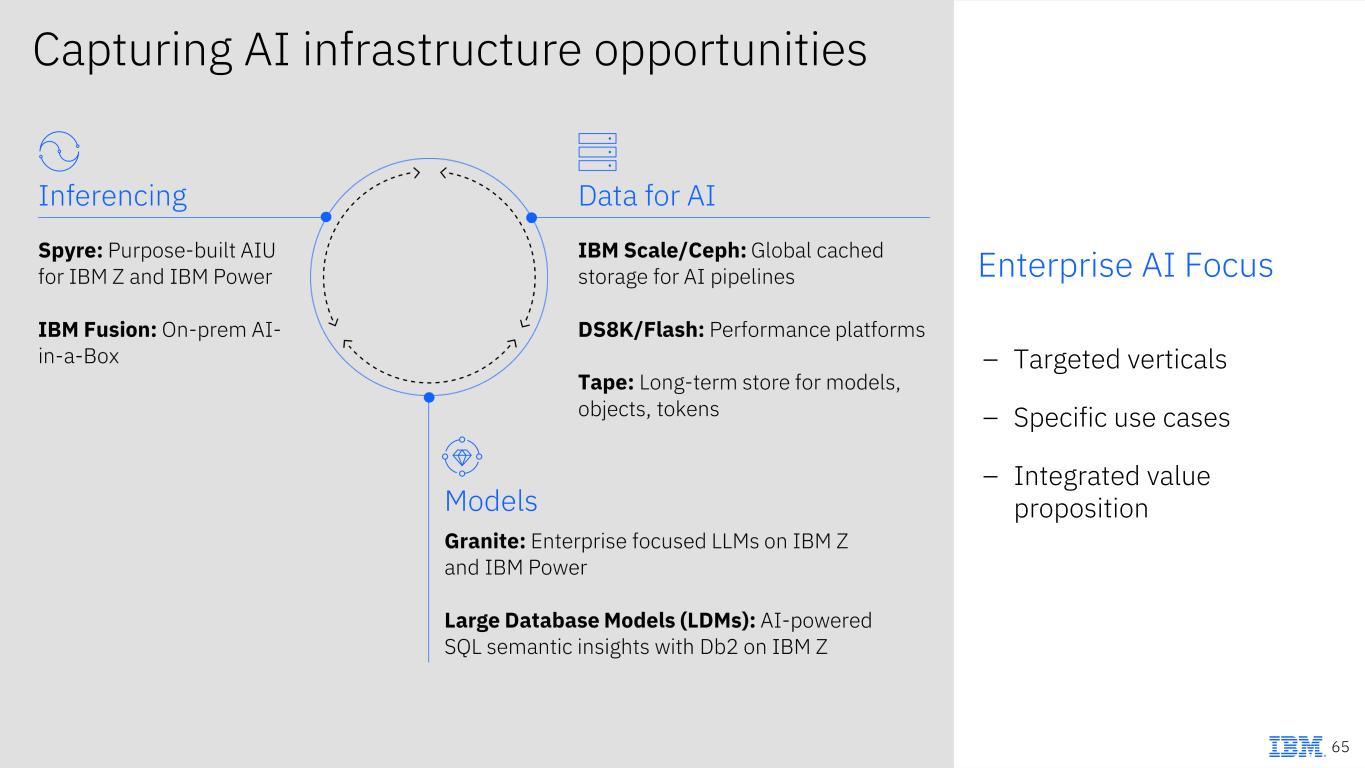 Execution Excellence Innovation for Growth Mainframe Storage – CyberVault and Safeguarded copies – End-to-end encryption – Compliance and regulation Software Investment Ecosystem Inventory/Supply Chain Optimization Value Capture Distributed and Tape – Computational storage – Real-time ransomware detection – Persistent long-term storage Software Defined Storage – High-performance storage software to disrupt traditional arrays – AI acceleration (Ceph, Scale) – Integrated vector database processing (Content-Aware Storage) Growing Storage faster than the market 64
