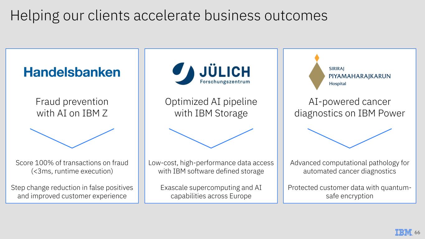 66 Optimized AI pipeline with IBM Storage Low-cost, high-performance data access with IBM software defined storage Exascale supercomputing and AI capabilities across Europe Fraud prevention with AI on IBM Z Score 100% of transactions on fraud (<3ms, runtime execution) Step change reduction in false positives and improved customer experience AI-powered cancer diagnostics on IBM Power Advanced computational pathology for automated cancer diagnostics Protected customer data with quantum- safe encryption Helping our clients accelerate business outcomes