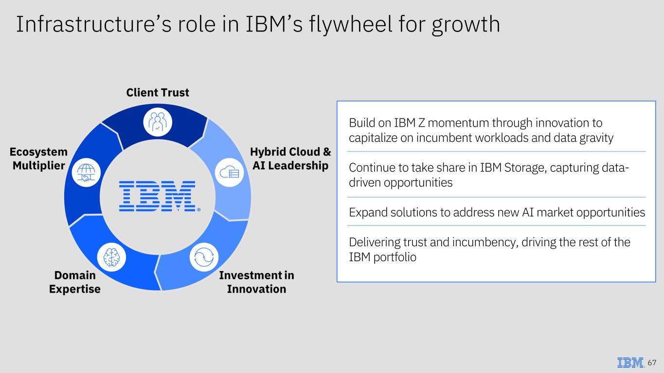 Build on IBM Z momentum through innovation to capitalize on incumbent workloads and data gravity Continue to take share in IBM Storage, capturing data- driven opportunities Expand solutions to address new AI market opportunities Delivering trust and incumbency, driving the rest of the IBM portfolio Infrastructure’s role in IBM’s flywheel for growth 67