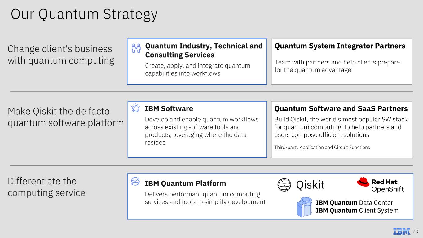 Our Quantum Strategy Change client's business with quantum computing Quantum Industry, Technical and Consulting Services Create, apply, and integrate quantum capabilities into workflows Make Qiskit the de facto quantum software platform IBM Software Develop and enable quantum workflows across existing software tools and products, leveraging where the data resides Differentiate the computing service IBM Quantum Platform Delivers performant quantum computing services and tools to simplify development IBM Quantum Data Center IBM Quantum Client System 70 Quantum System Integrator Partners Team with partners and help clients prepare for the quantum advantage Quantum Software and SaaS Partners Build Qiskit, the world's most popular SW stack for quantum computing, to help partners and users compose efficient solutions Third-party Application and Circuit Functions