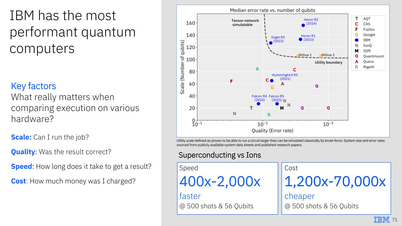 IBM has the most performant quantum computers Superconducting vs Ions Speed 400x-2,000x faster @ 500 shots & 56 Qubits Cost 1,200x-70,000x cheaper @ 500 shots & 56 Qubits Key factors What really matters when comparing execution on various hardware? Scale: Can I run the job? Quality: Was the result correct? Speed: How long does it take to get a result? Cost: How much money was I charged? Utility scale defined as proven to be able to run a circuit larger than can be simulated classically by brute-force. System size and error rates sourced from publicly available system data sheets and published research papers. 71