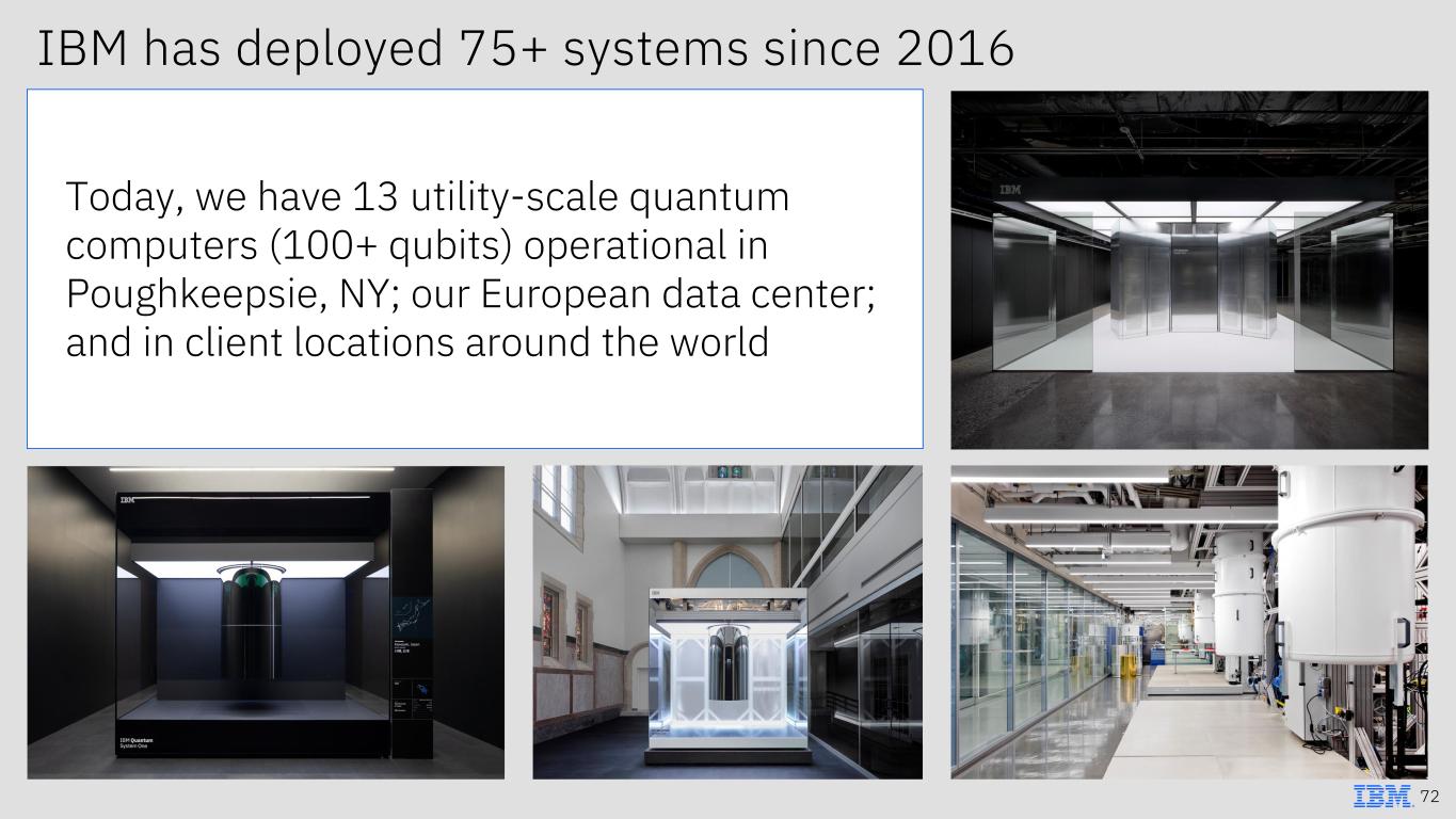 IBM has deployed 75+ systems since 2016 Today, we have 13 utility-scale quantum computers (100+ qubits) operational in Poughkeepsie, NY; our European data center; and in client locations around the world 72