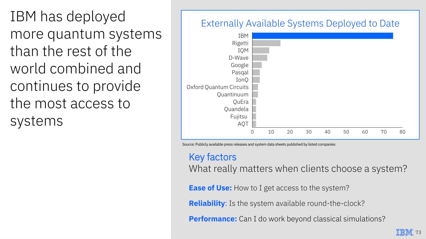 IBM has deployed more quantum systems than the rest of the world combined and continues to provide the most access to systems Key factors What really matters when clients choose a system? Ease of Use: How to I get access to the system? Reliability: Is the system available round-the-clock? Performance: Can I do work beyond classical simulations? Source: Publicly available press releases and system data sheets published by listed companies 73 Externally Available Systems Deployed to Date