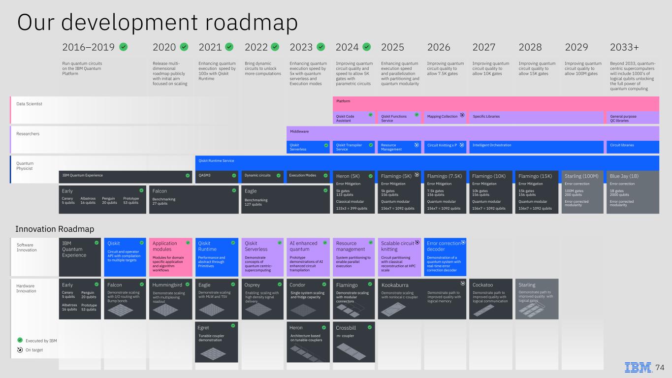 Our development roadmap Hardware Innovation Software Innovation Researchers Quantum Physicist Data Scientist Run quantum circuits on the IBM Quantum Platform Release multi- dimensional roadmap publicly with initial aim focused on scaling Enhancing quantum execution speed by 100x with Qiskit Runtime Bring dynamic circuits to unlock more computations Enhancing quantum execution speed by 5x with quantum serverless and Execution modes Improving quantum circuit quality and speed to allow 5K gates with parametric circuits Enhancing quantum execution speed and parallelization with partitioning and quantum modularity Improving quantum circuit quality to allow 7.5K gates Improving quantum circuit quality to allow 10K gates Improving quantum circuit quality to allow 15K gates Improving quantum circuit quality to allow 100M gates Beyond 2033, quantum- centric supercomputers will include 1000’s of logical qubits unlocking the full power of quantum computing Platform Qiskit Code Assistant Qiskit Functions Service General purpose QC libraries Middleware Qiskit Serverless Qiskit Transpiler Service Resource Management Circuit Knitting x P Intelligent Orchestration Circuit libraries Qiskit Runtime Service QASM3 Dynamic circuits Execution Modes Falcon Benchmarking 27 qubits Eagle Benchmarking 127 qubits Heron (5K) Error Mitigation 5k gates 133 qubits Classical modular 133x3 = 399 qubits Flamingo (7.5K) Error Mitigation 7.5k gates 156 qubits Quantum modular 156x7 = 1092 qubits Flamingo (10K) Error Mitigation 10k gates 156 qubits Quantum modular 156x7 = 1092 qubits Flamingo (15K) Error Mitigation 15k gates 156 qubits Quantum modular 156x7 = 1092 qubits Starling (100M) Error correction 100M gates 200 qubits Error corrected modularity Falcon Demonstrate scaling with I/O routing with Bump bonds Hummingbird Eagle Demonstrate scaling with MLW and TSV Osprey Condor Flamingo Demonstrate scaling with modular connectors StarlingKookaburra Demonstrate scaling with nonlocal c-coupler Cockatoo Single system scaling and fridge capacity Flamingo (5K) Error Mitigation 5k gates 156 qubits Quantum modular 156x7 = 1092 qubits Heron Crossbill m- coupler Demonstrate path to improved quality with logical communication Early Canary 5 qubits Albatross 16 qubits Penguin 20 qubits Prototype 53 qubits IBM Quantum Experience Mapping Collection Specific Libraries Qiskit Circuit and operator API with compilation to multiple targets Application modules Modules for domain specific application and algorithm workflows Qiskit Runtime Performance and abstract through Primitives Qiskit Serverless Demonstrate concepts of quantum centric- supercomputing AI enhanced quantum Prototype demonstrations of AI enhanced circuit transpilation Resource management System partitioning to enable parallel execution Scalable circuit knitting Circuit partitioning with classical reconstruction at HPC scale Error correction decoder Demonstration of a quantum system with real-time error correction decoder Early Canary 5 qubits Albatross 16 qubits Penguin 20 qubits Prototype 53 qubits IBM Quantum Experience Demonstrate path to improved quality with logical memory 2016–2019 2020 2021 2022 2023 2024 2025 2026 2027 2028 2029 2033+ Innovation Roadmap Executed by IBM On target Demonstrate path to improved quality with logical gates Demonstrate scaling with multiplexing readout Enabling scaling with high density signal delivery Architecture based on tunable-couplers Blue Jay (1B) Error correction 1B gates 2000 qubits Error corrected modularity Egret Tunable coupler demonstration 74