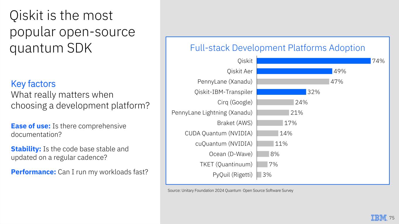 Qiskit is the most popular open-source quantum SDK Key factors What really matters when choosing a development platform? Ease of use: Is there comprehensive documentation? Stability: Is the code base stable and updated on a regular cadence? Performance: Can I run my workloads fast? Source: Unitary Foundation 2024 Quantum Open Source Software Survey Full-stack Development Platforms Adoption 75