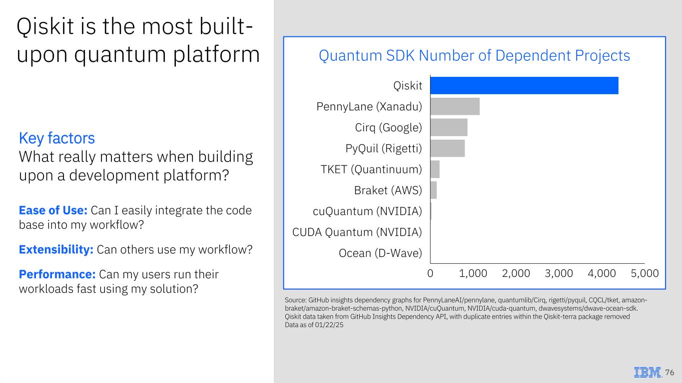Qiskit is the most built- upon quantum platform Key factors What really matters when building upon a development platform? Ease of Use: Can I easily integrate the code base into my workflow? Extensibility: Can others use my workflow? Performance: Can my users run their workloads fast using my solution? Source: GitHub insights dependency graphs for PennyLaneAI/pennylane, quantumlib/Cirq, rigetti/pyquil, CQCL/tket, amazon- braket/amazon-braket-schemas-python, NVIDIA/cuQuantum, NVIDIA/cuda-quantum, dwavesystems/dwave-ocean-sdk. Qiskit data taken from GitHub Insights Dependency API, with duplicate entries within the Qiskit-terra package removed Data as of 01/22/25 76 Quantum SDK Number of Dependent Projects